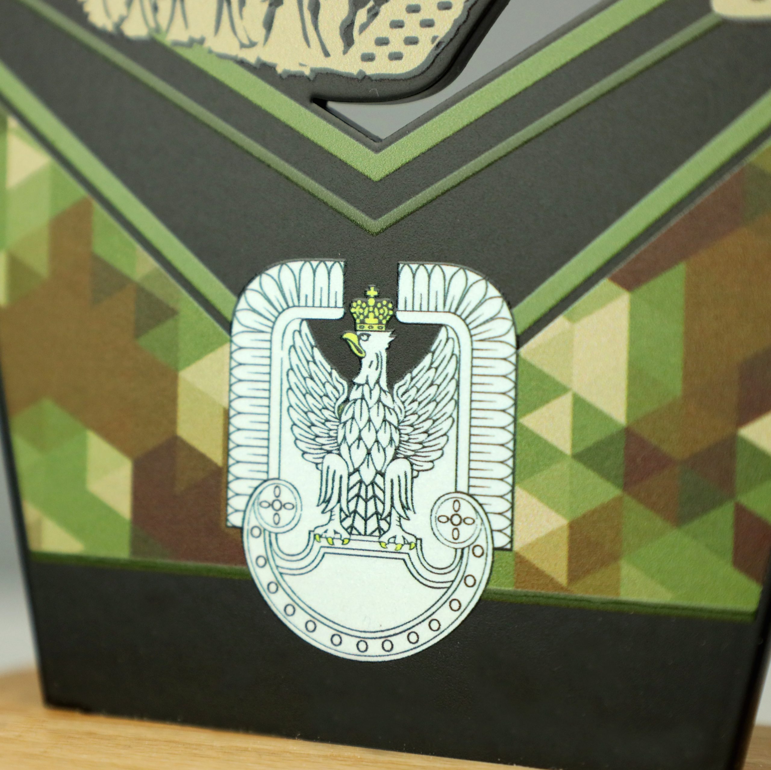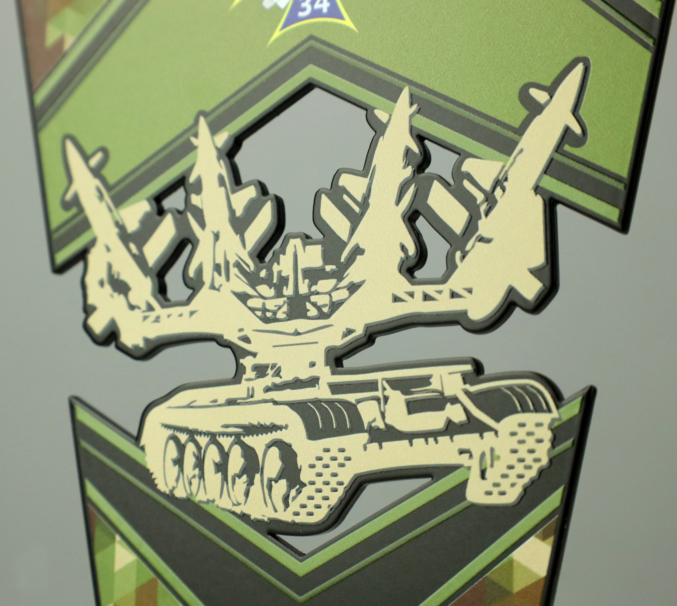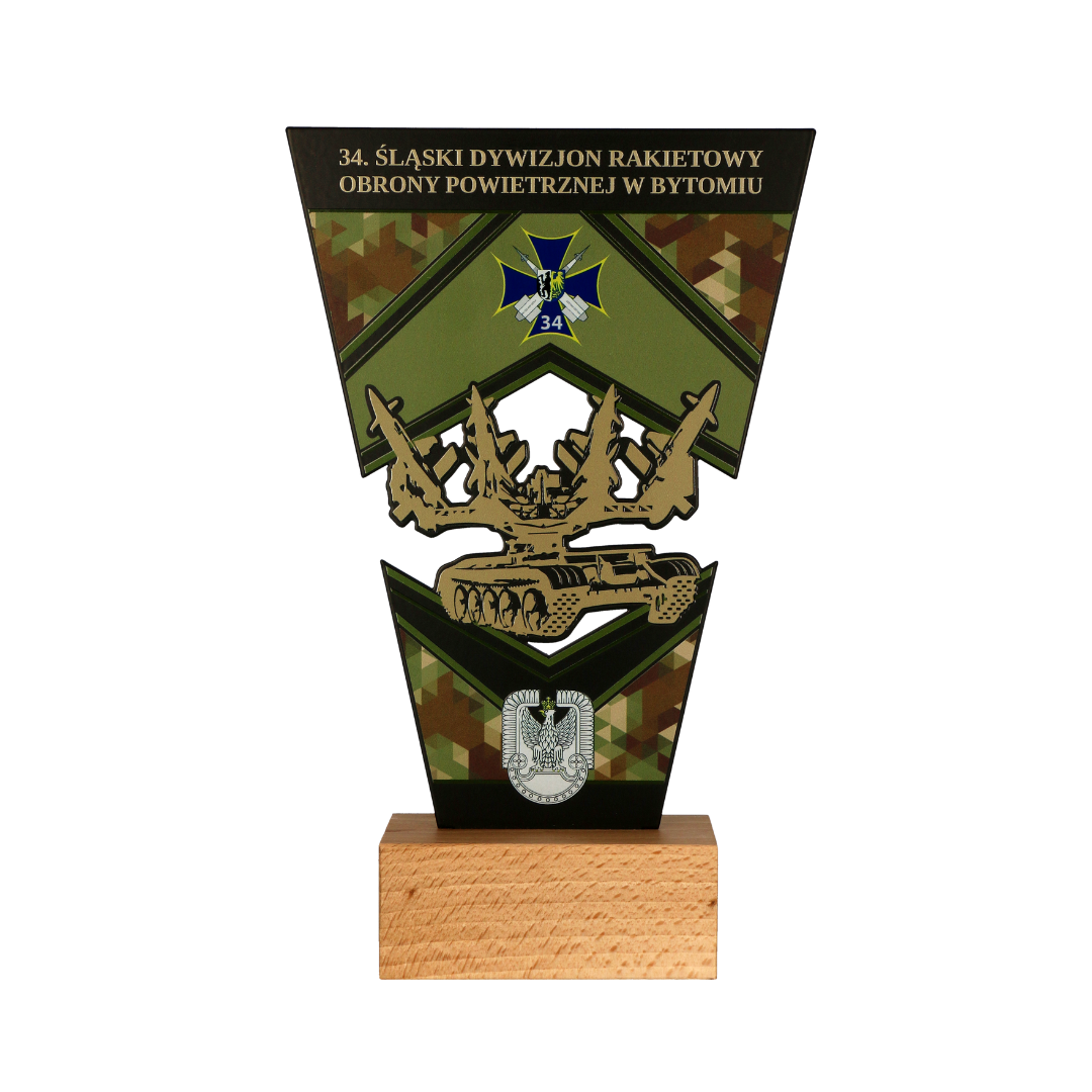 Statuetka metalowa na drewnianej podstawie. Na jubileusz 34. Śląskiego Dywizjonu Rakietowego Obrony Powietrznej w Bytomiu przygotowaliśmy statuetki które wręczane były żołnierzom. Dzięki ogromnym możliwością parku maszynowego stworzyliśmy wojskowe trofea wycinane laserowo, które efektownie uzupełnił nadruk UV.