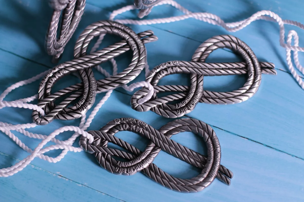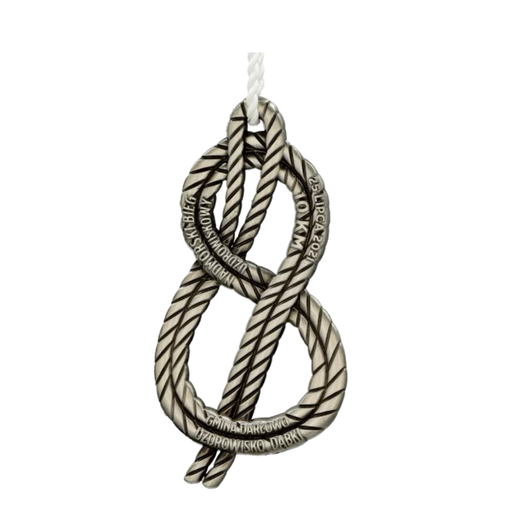 Medal odlewany 3D na 8 Bieg Uzdrowiskowy w Dąbkach. Kolejna już edycja biegu na który mieliśmy przyjemność wykonać medale, tym razem zdecydowano się na „8” zrobioną ze sznura, z nazwą biegu, datą i dystansem.