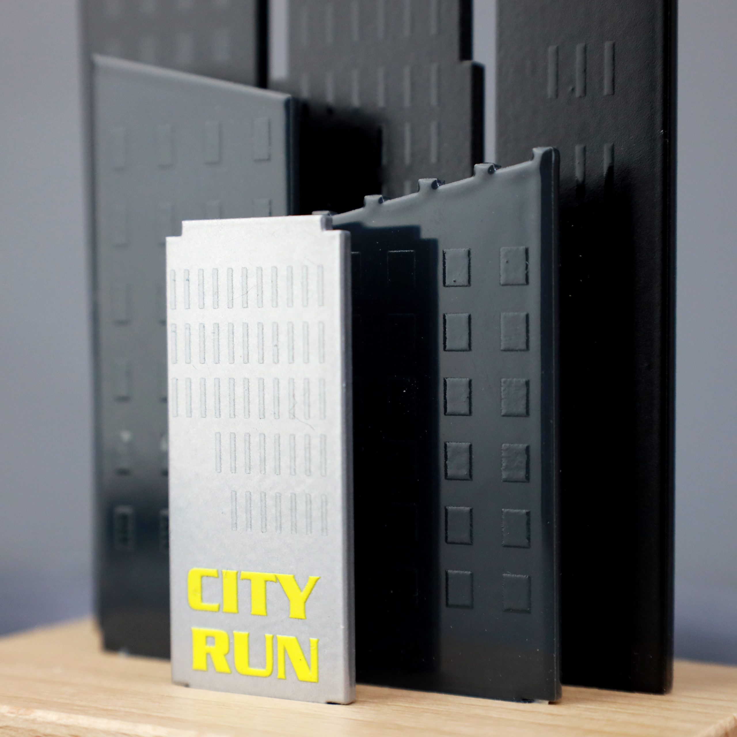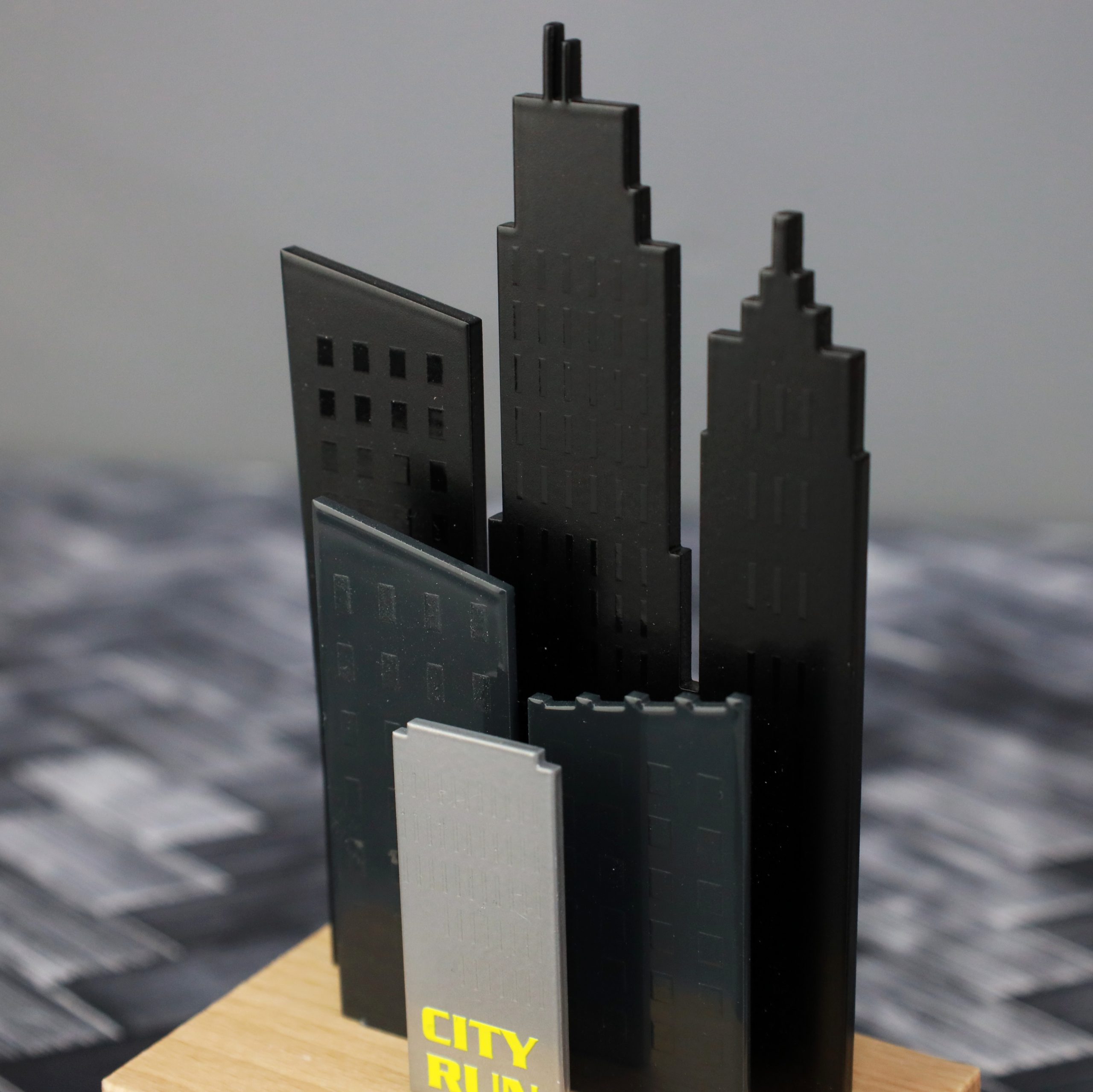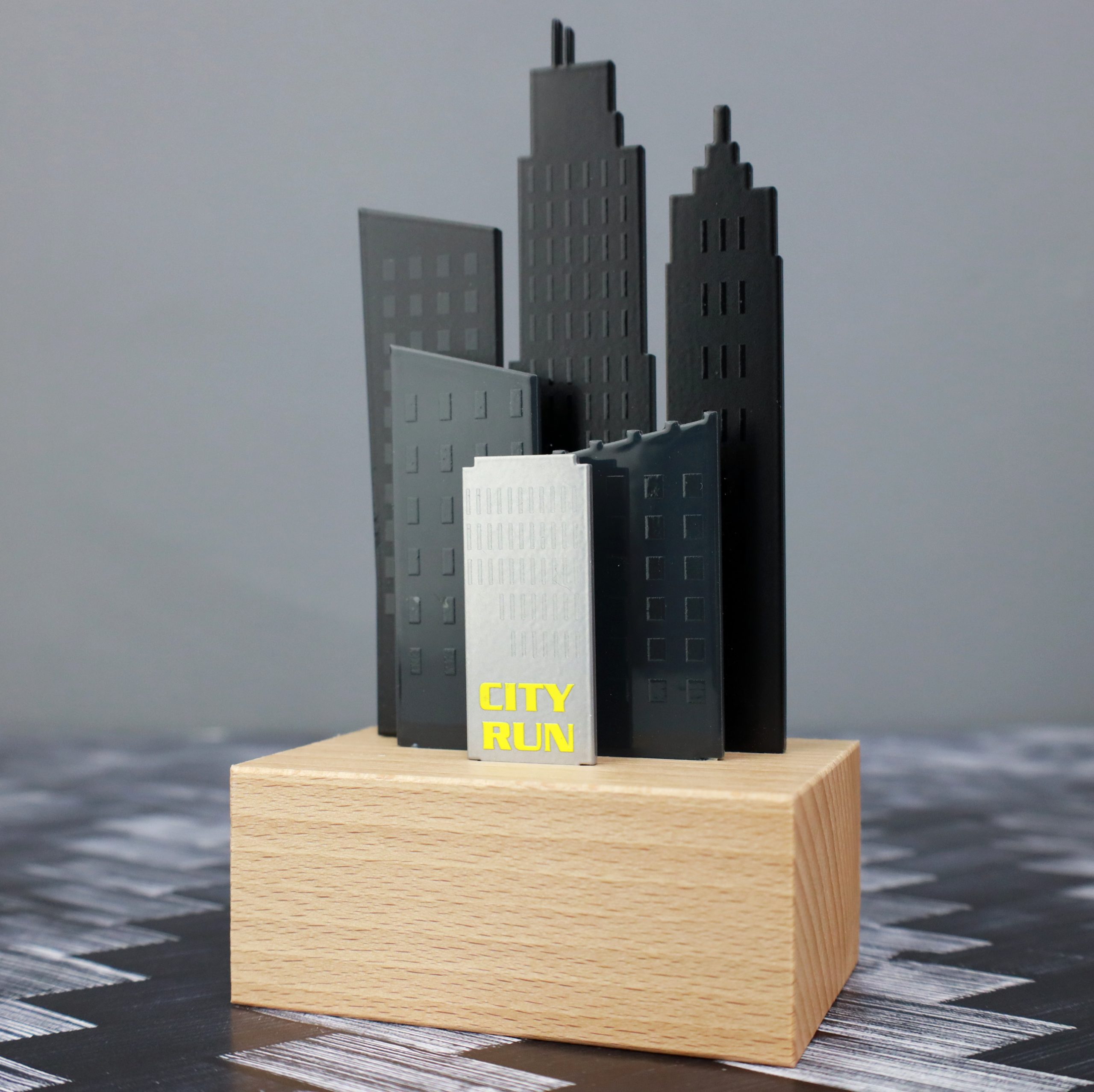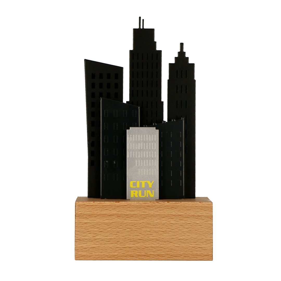 Statuetka wielomateriałowa City Run to imitacja miasta na drewnianej podstawie. Statuetki metalowe kończą się na dwóch panelach, jeśli chcemy umieścić ich więcej, zrobić skomplikowany projekt, wkraczamy za kurtyny statuetek wielomateriałowych. Statuetka z nazwą imprezy i przymocowanymi do drewna panelami metalowymi które zostały polakierowane.