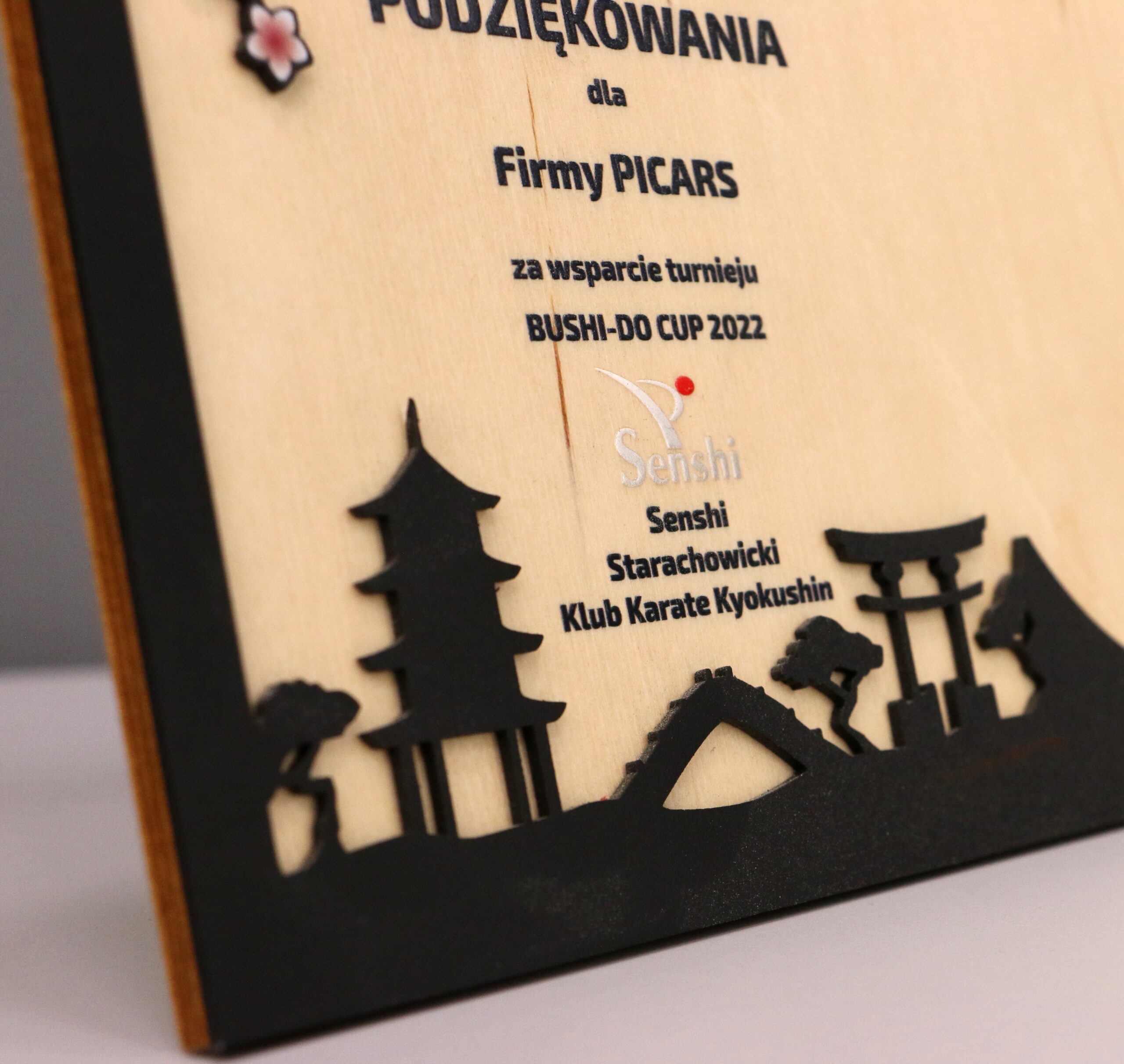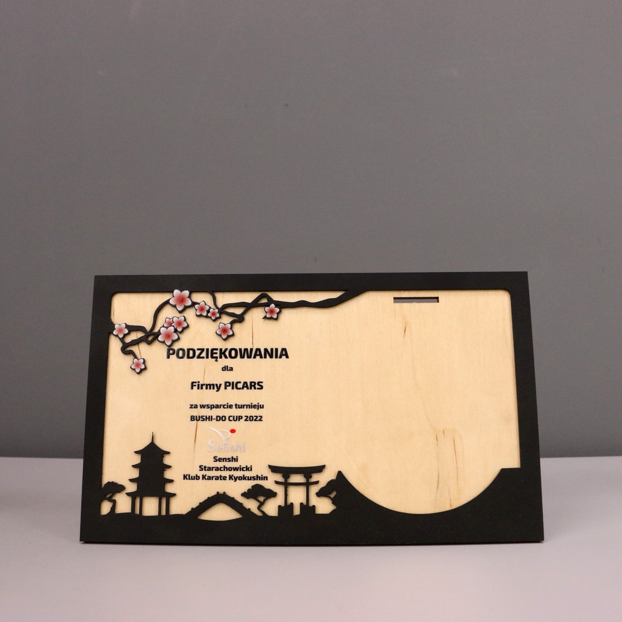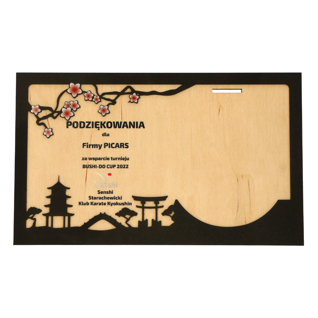 Statuetka-dyplom czyli drewniany panel ze sklejki na który nałożyliśmy wycięty laserowo panel metalowy z elementami Japońskiej kultury. Sklejkę pokryliśmy nadrukiem UV umieszczając w ten sposób konieczne do zawarcia na dyplomie informacje. W górnym elemencie sklejki wykonaliśmy nacięcie, jest to miejsce na medal ze wstążką z turnieju na który wykonaliśmy dyplom w ramach podziękowań.