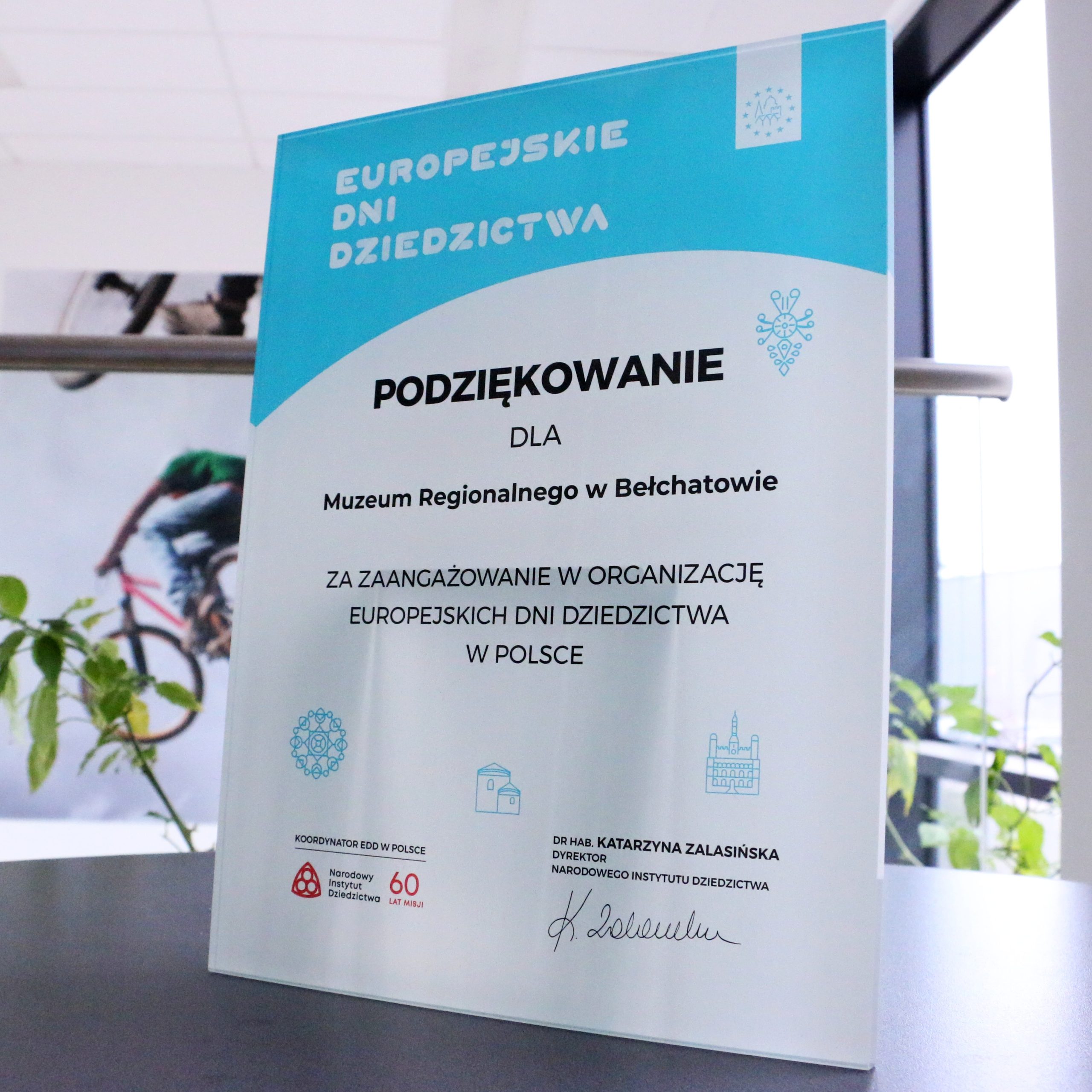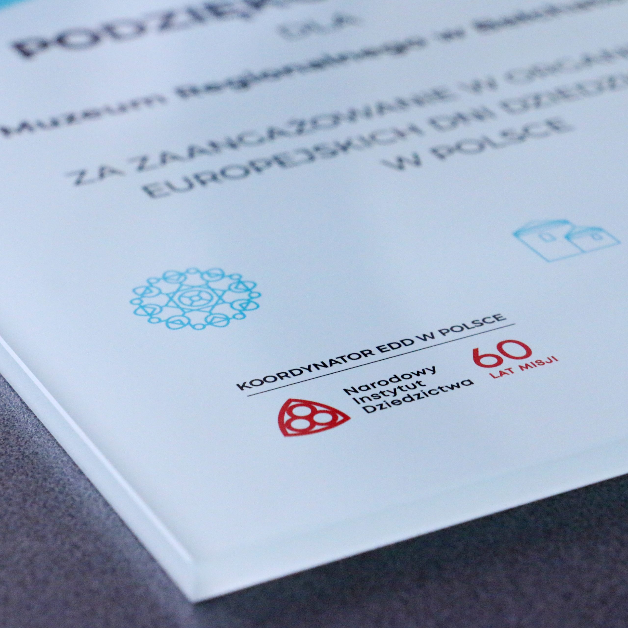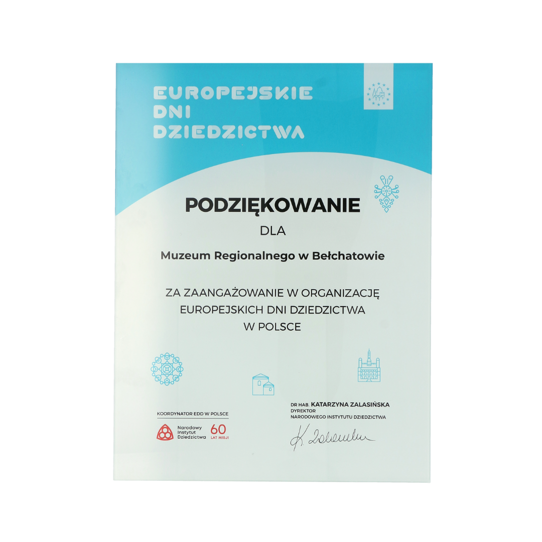 Dyplom w całości ze szkła, z nadrukiem UV. Wręczony z okazji Europejskich Dni Dziedzictwa.