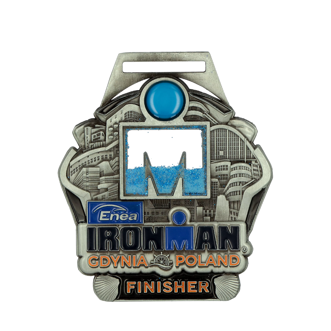 Medal odlewany 3D ze specjalnym elementem w centrum medalu jakim jest przeźroczysta litera M z niebieskim połyskującym piaskiem wewnątrz. Na uczestników Ironman Gdynia czekał na mecie jeden z najbardziej efektowych medali jakie udało nam się wyprodukować. Trudna trasa, obejmująca 1,9 km pływania, 90 km jazdy na rowerze oraz 21,1 km biegu wymaga wyjątkowej nagrody za jej ukończenie. Według naszej opinii stanęliśmy na wysokości zadania 🙂