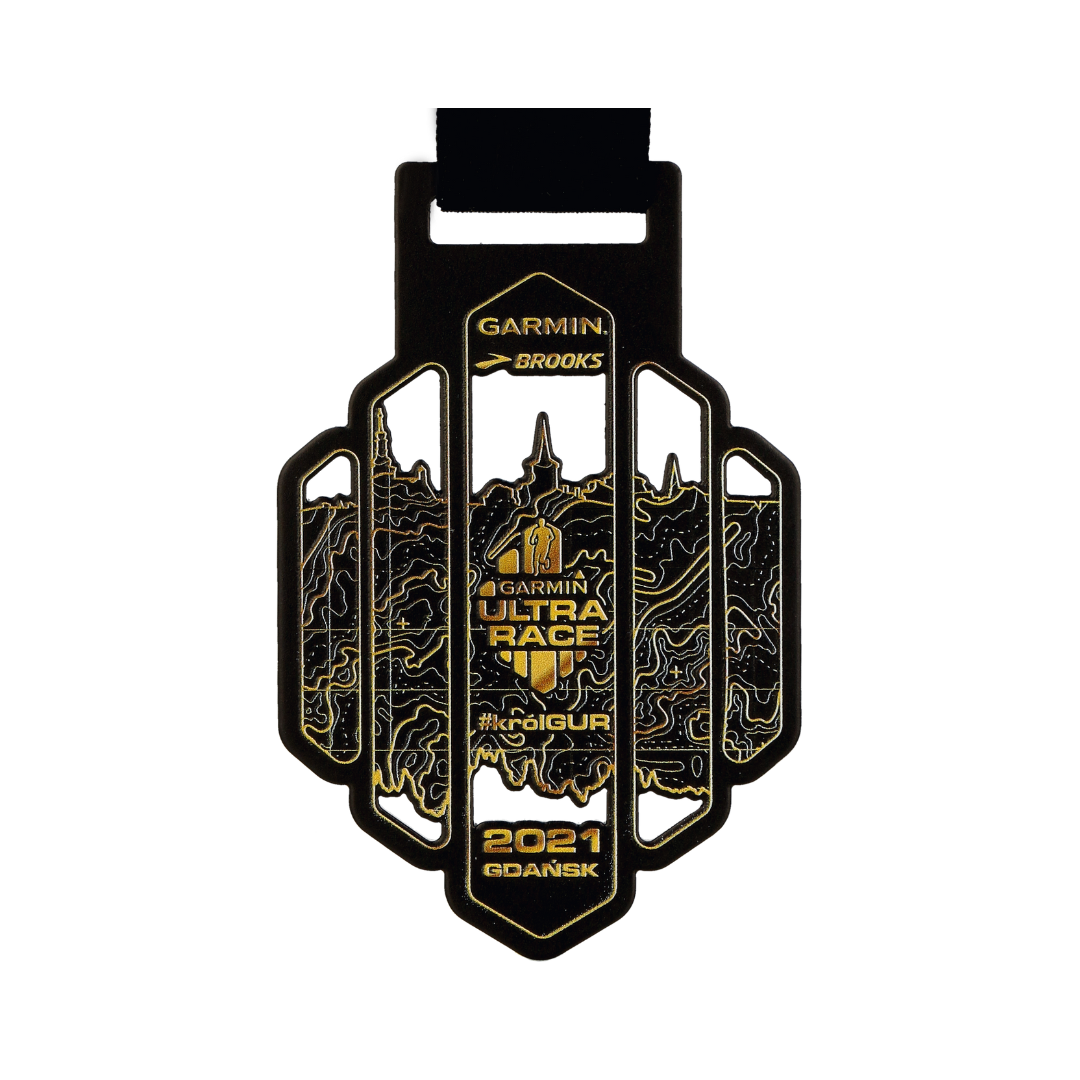 Medal serii Lasercut cięty laserowo z wyciętymi ażurami w kolorze czarnym i warstwowym nadrukiem UV. Nagrody wykonaliśmy na Garmin Ultra Race który odbywał się w Gdańsku. Wydarzenie to cykl biegów ultra, coś dla biegaczy z doświadczeniem i niezłą kondycją ponieważ zawodnicy rywalizują ze sobą na dystansach 84 km, 53 km, 27 km oraz 12 km. Trasa wiedzie przez Trójmiejski Park Krajobrazowy a na jej mecie czekali organizatorzy z naszymi medalami.
