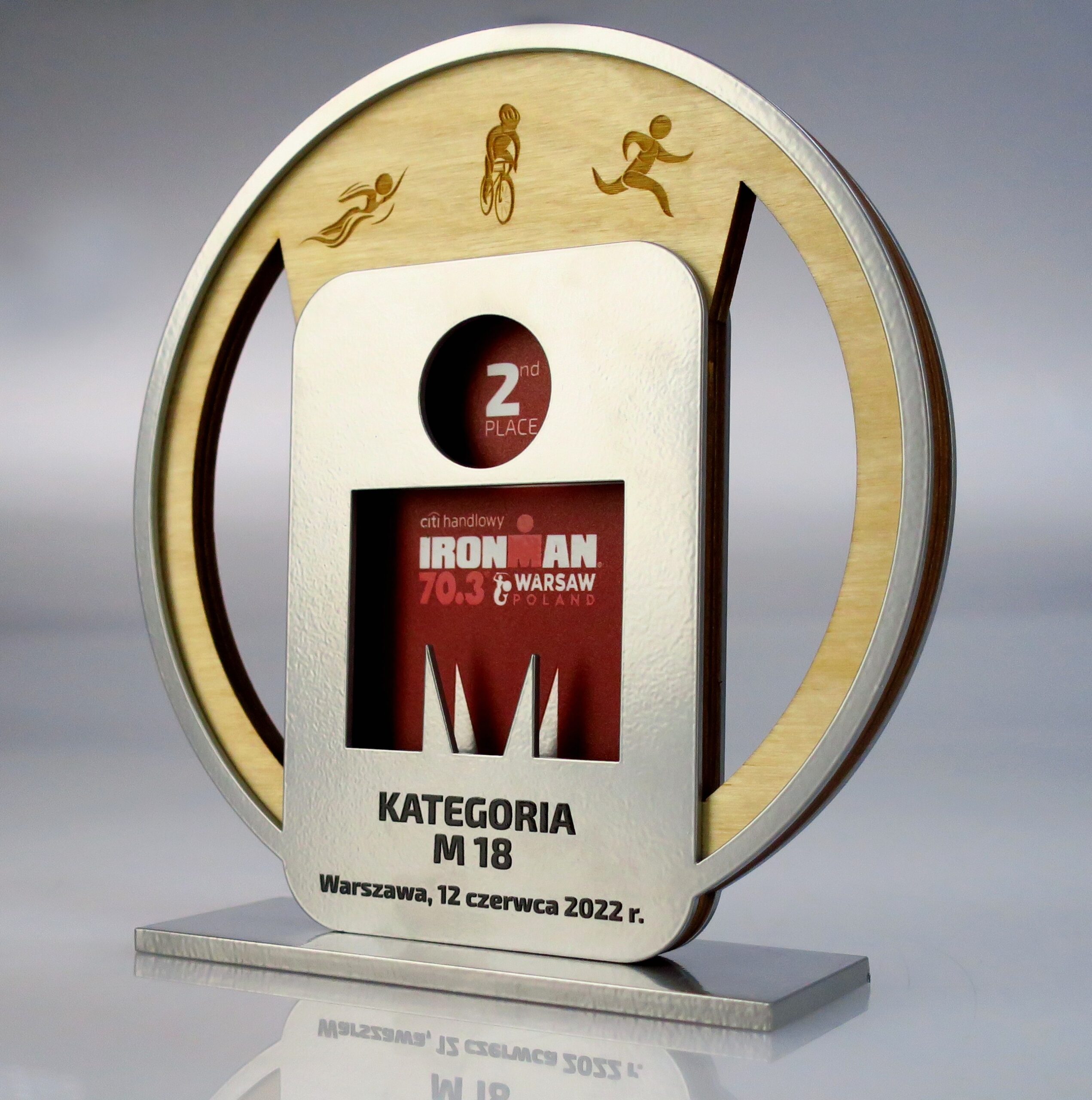 Statuetka wielomateriałowa czyli połączenie warstw metalu z drewnem. Powierzchnię personalizowaliśmy grawerem oraz nadrukiem UV. Kilka paneli metalowych z panelem drewnianym dały świetny efekt przestrzennej statuetki. Grawer uszlachetnił nagrodę, wykonaliśmy nim symbole sportów triathlonowych.
