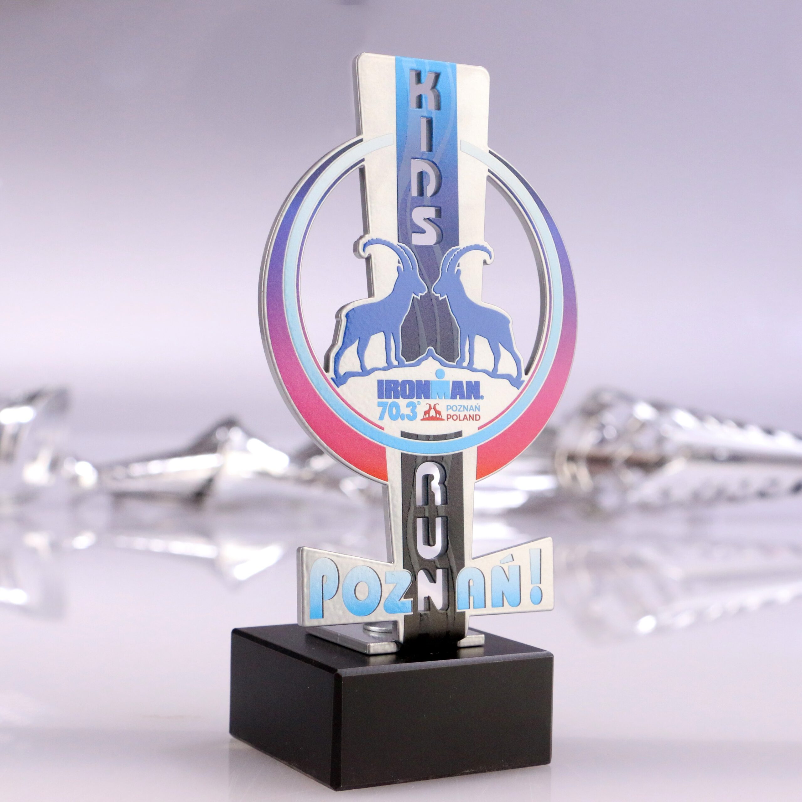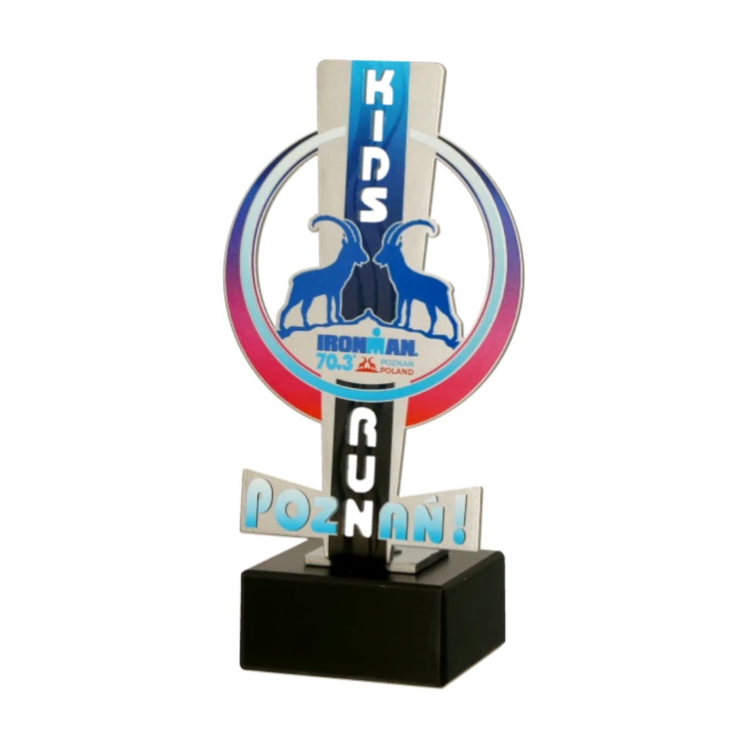 Statuetka z panelem metalowym obsadzonym na marmurowej podstawie z wyciętymi ażurami (prześwity) oraz warstwowym nadrukiem UV który uzupełnia całość nagrody.