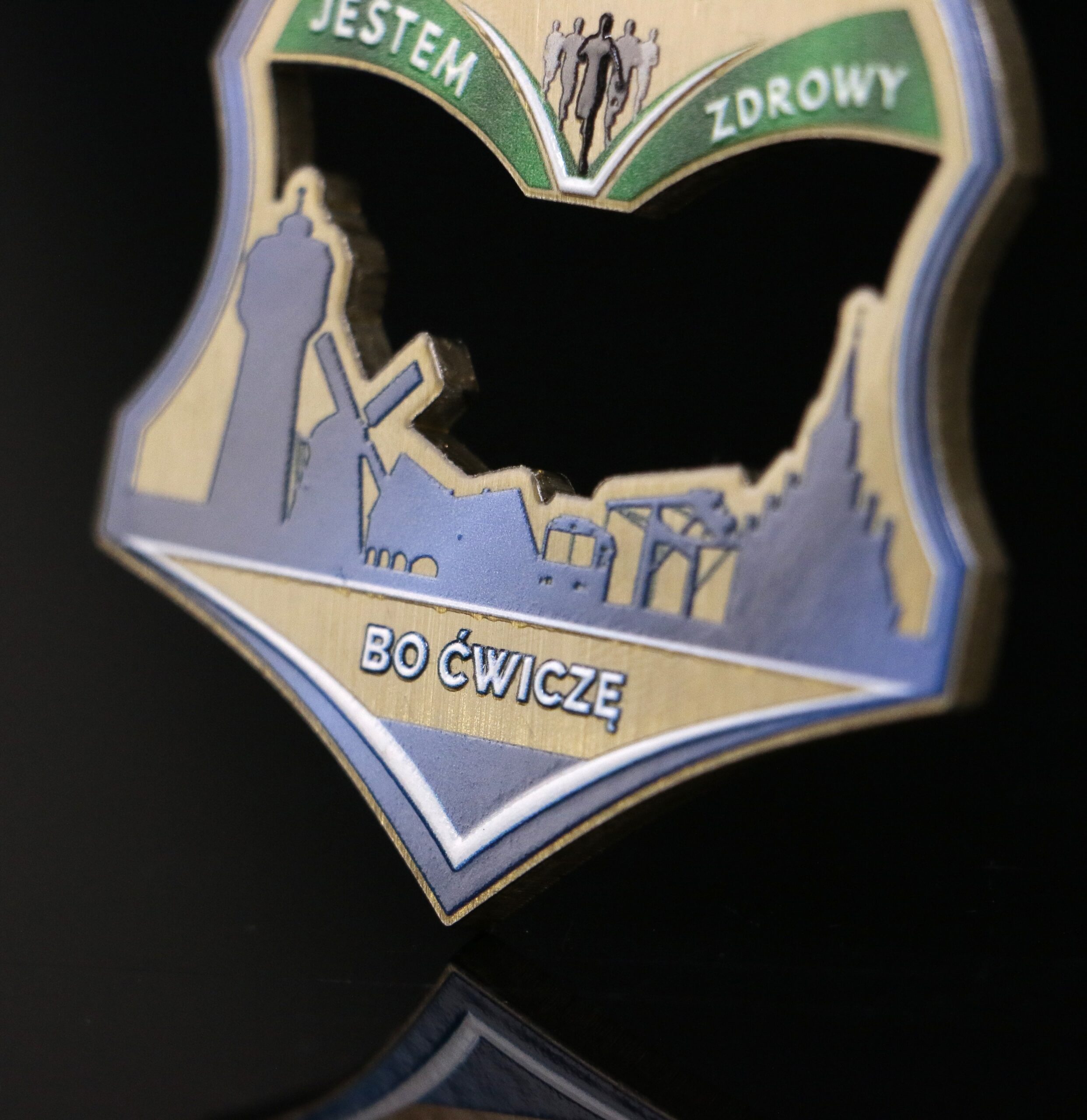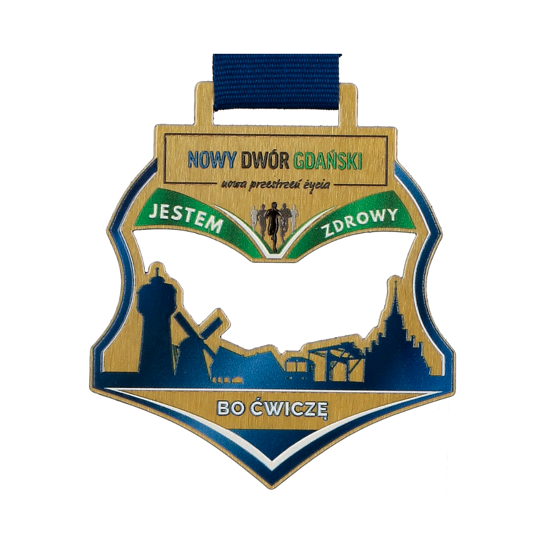 Medal wycinany laserowo Lasercut w bazowym złotym kolorze. Nagroda wykonana przez nas na piknik sportowy w Nowym Dworze Gdańskim, ażury w połączeniu z panoramą miasta i dodatkowymi elementami wykonanymi techniką warstwowego druku UV tworzą wyjątkową nagrodę na uczestników wydarzenia. Gmina co roku organizuje piknik sportowy by zarazić mieszkańców pozytywną energią i zachęcić do sportowego trybu życia który pozwoli cieszyć się lepszym zdrowiem.