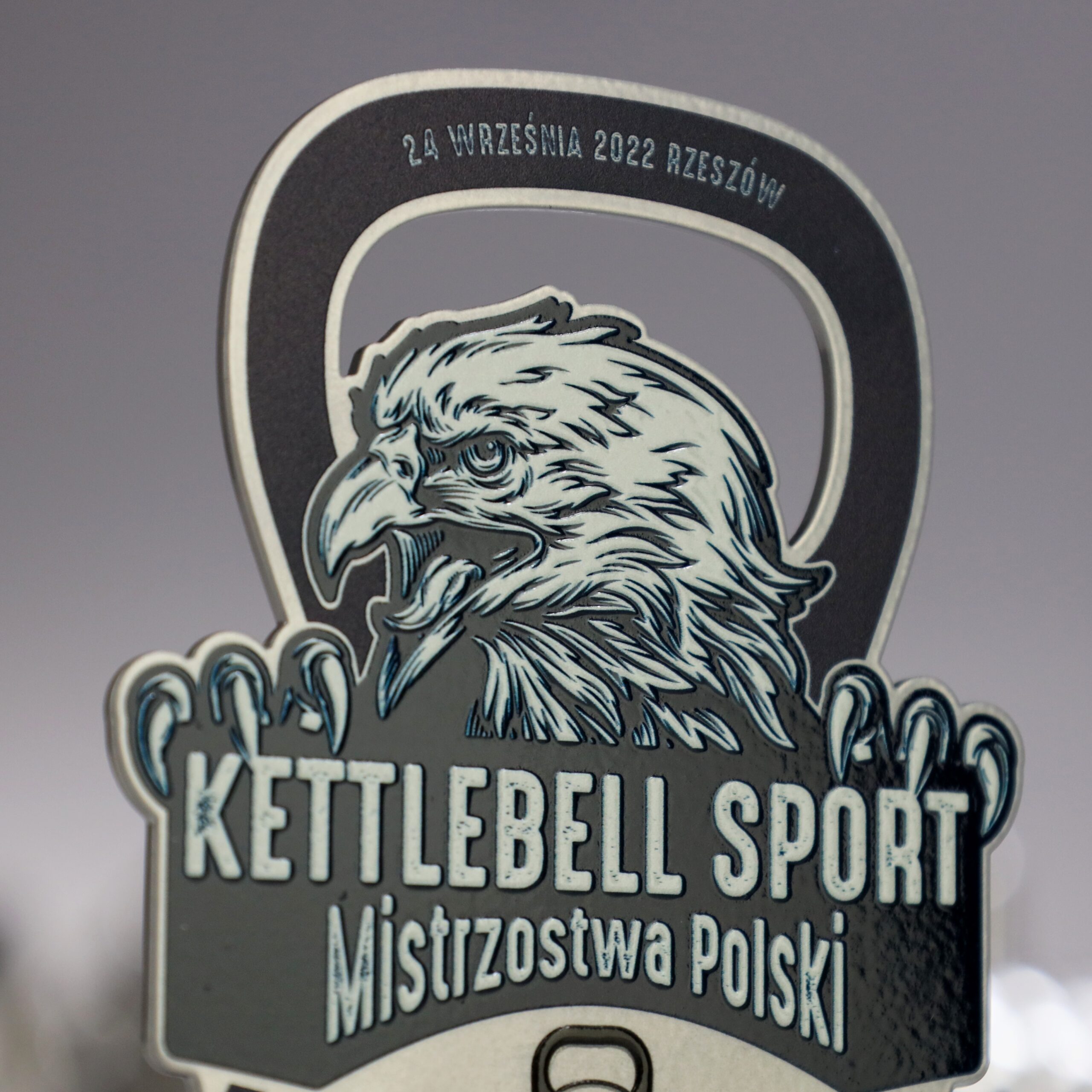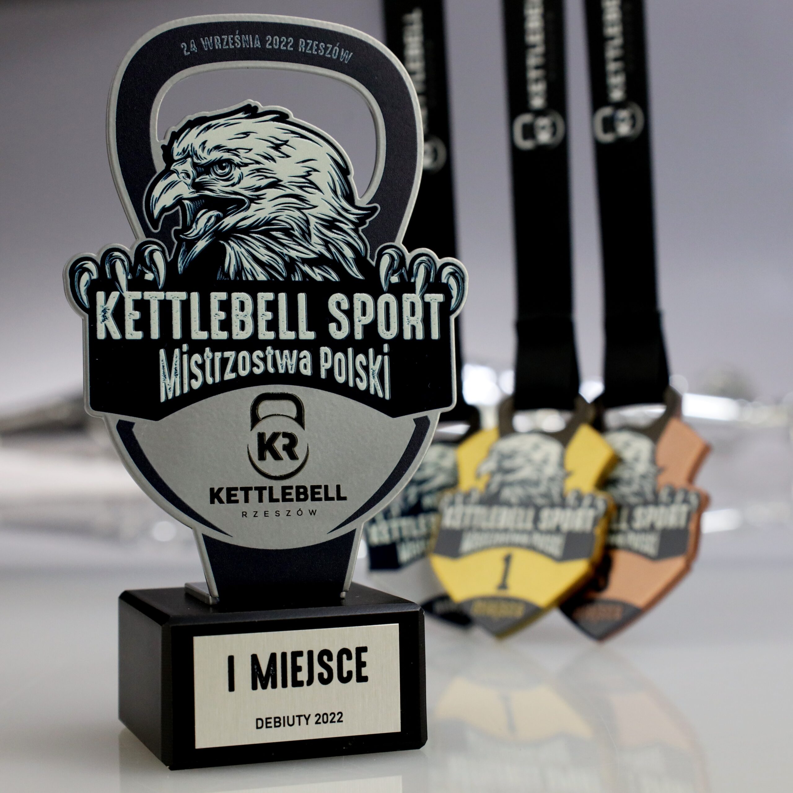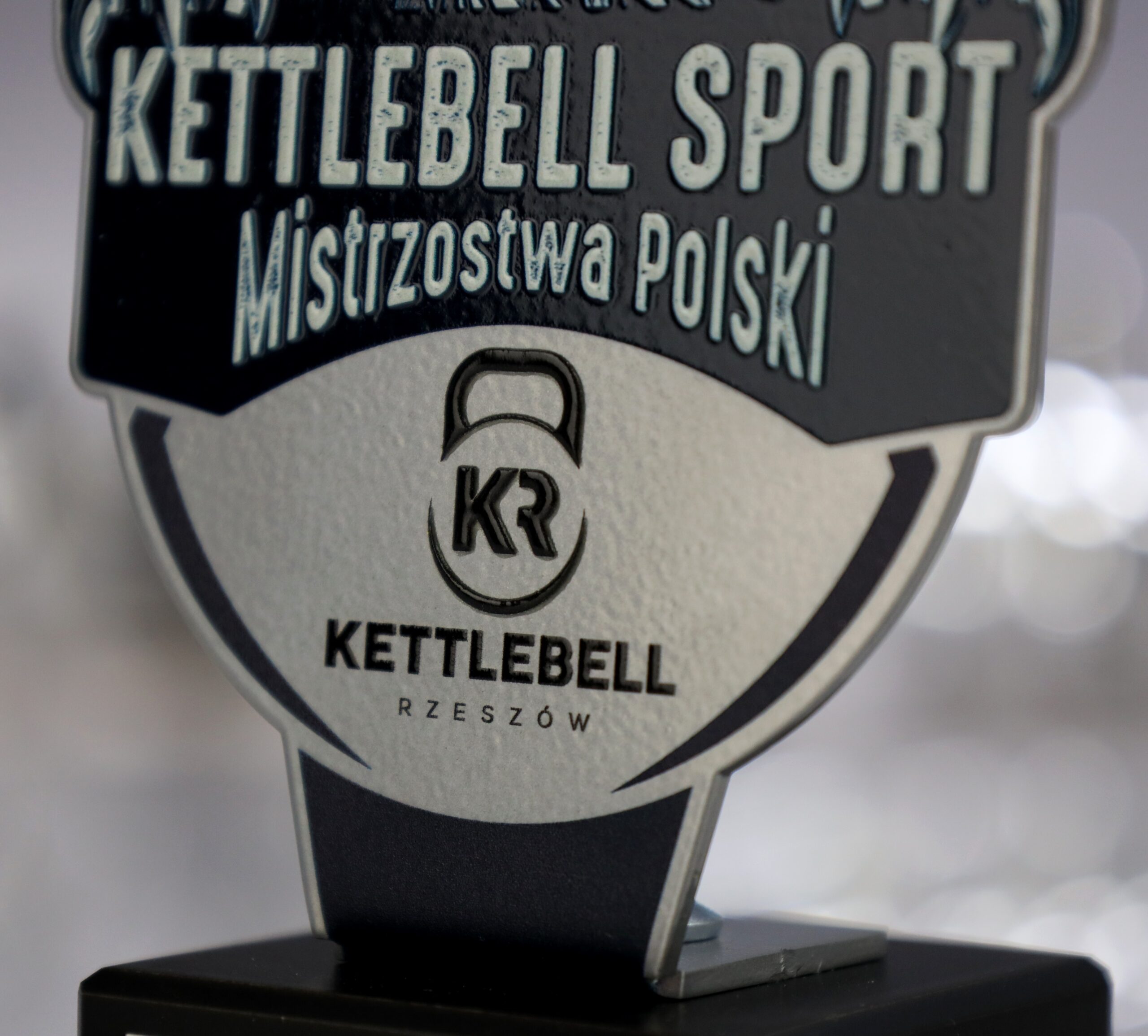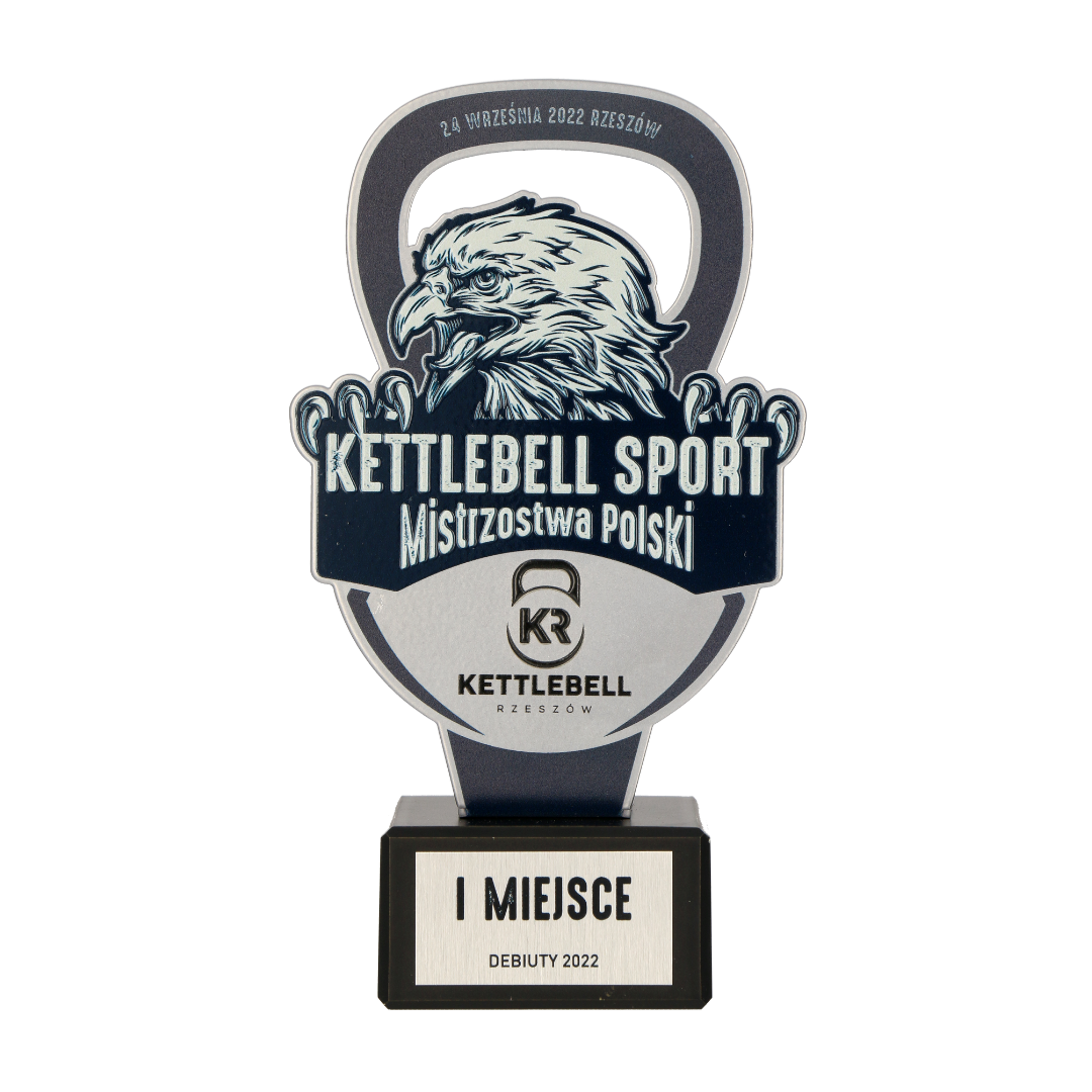 Statuetka metalowa z warstwowym nadrukiem UV na podstawie marmurowej. Nagrodę wycięliśmy laserowo na wzór Kettlebell oraz dodaliśmy orła aby nadać charakteru Mistrzostw Polski. Całość dopełniona napisami a to wszystko za pomocą warstwowego druku UV. Świetna i tematyczna statuetka na Mistrzostwa Polski Kettlebell Debiuty 2022 których gospodarzem był Rzeszów.