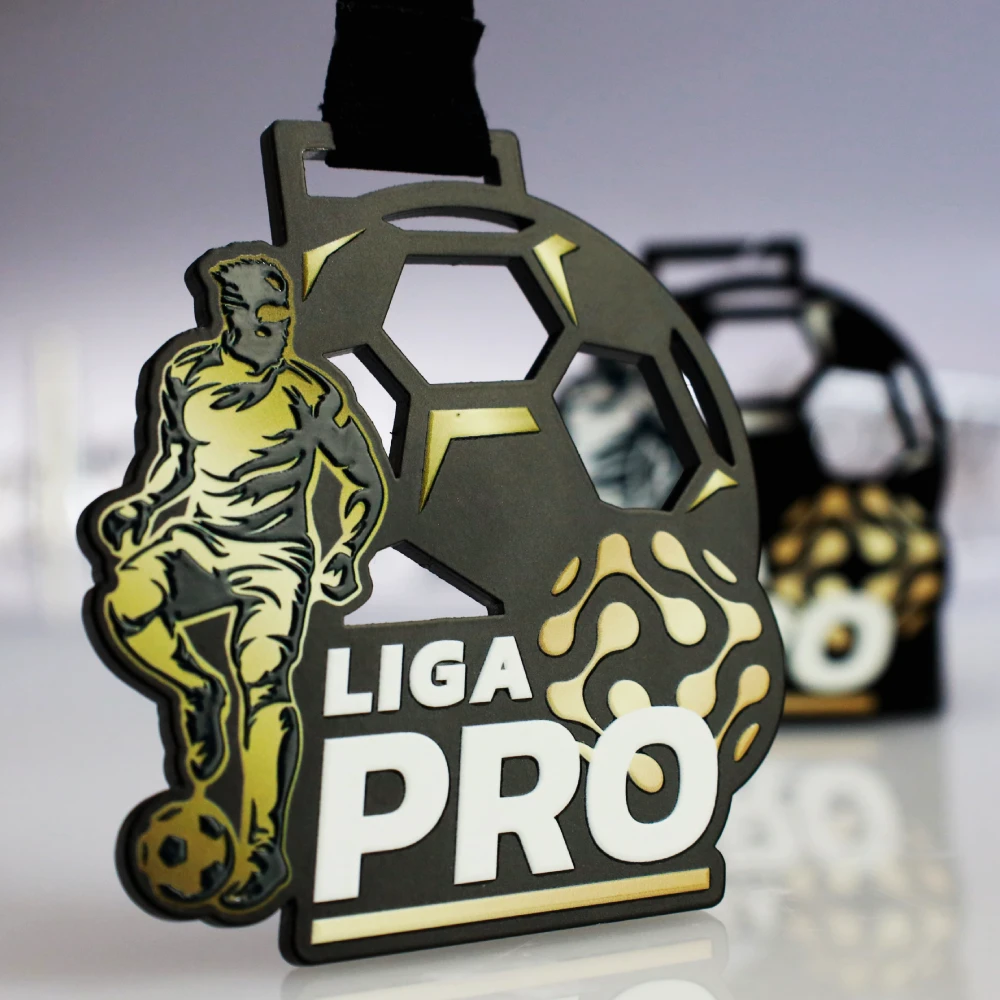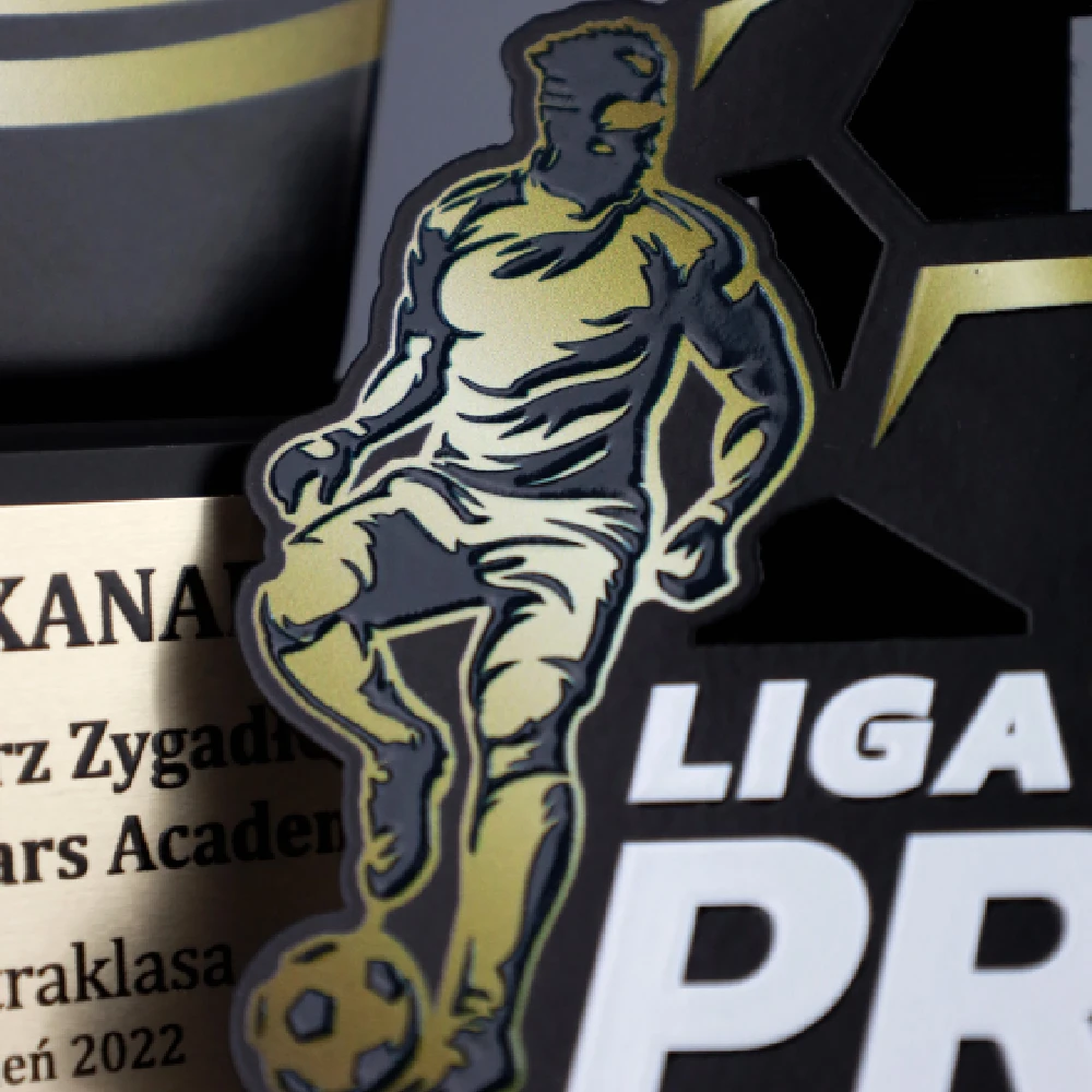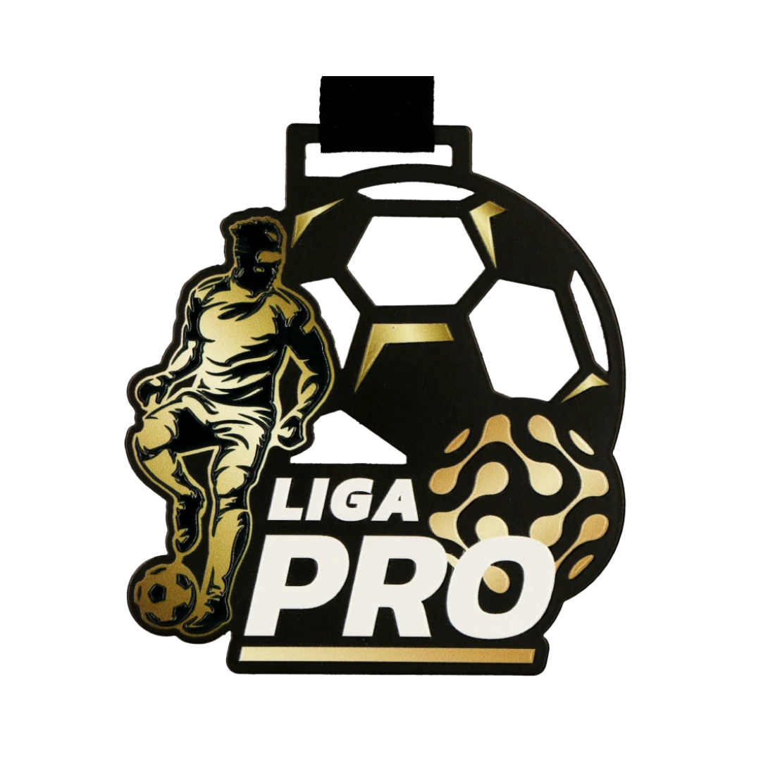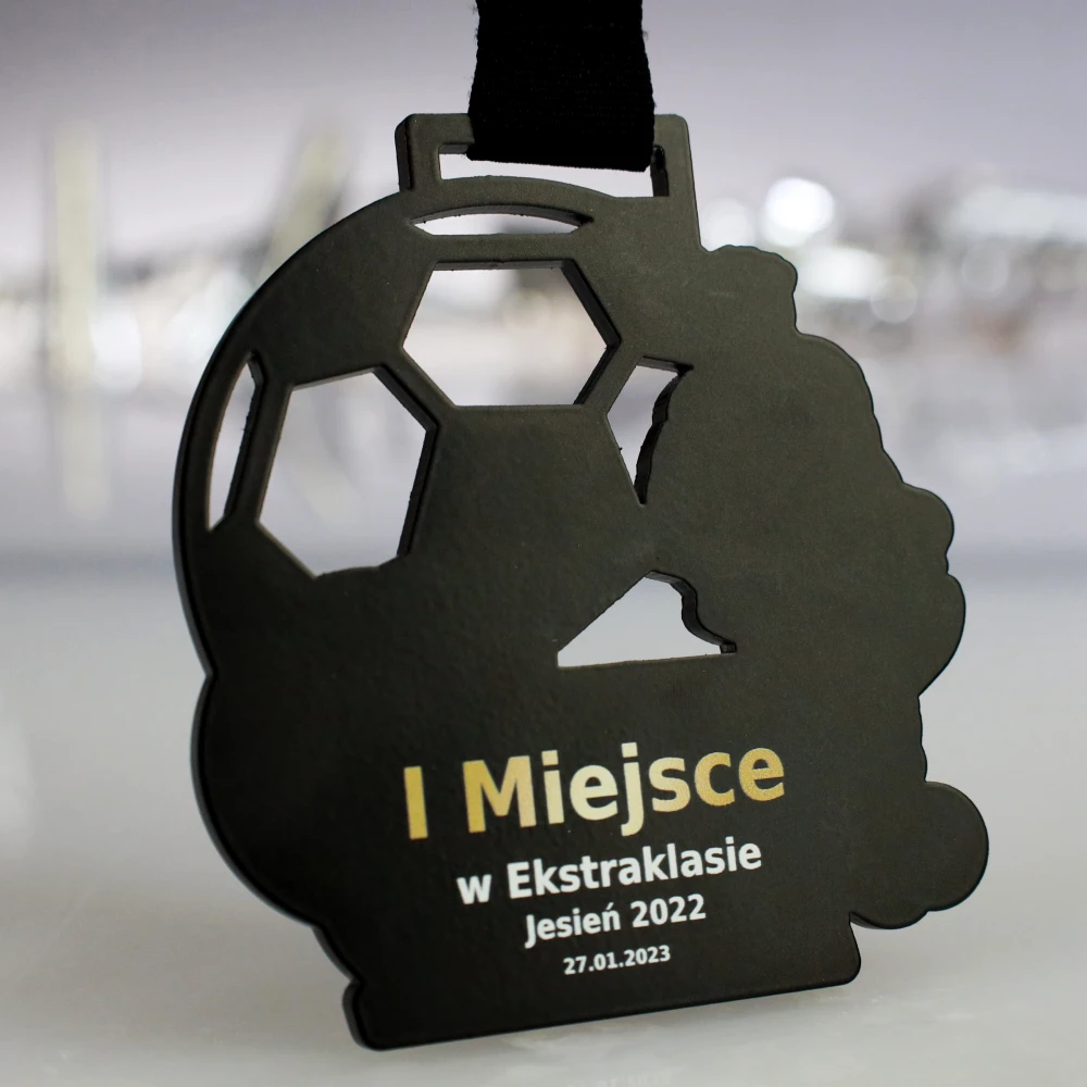 Medal stalowy Lasercut wycinany laserowo w bazowym czarnym kolorze. Medal został wykonany na ligę piłkarską Liga Pro we Wrocławiu. Nanieśliśmy na nagrodę na awersie (przód) warstwowy nadruk UV który jest wyczuwalny pod opuszkiem palca i nadaje efektu 3D. Rewers (tył) to nadruk standardowy ze wszystkimi istotnymi informacjami odnośnie osiągnieć w lidze.