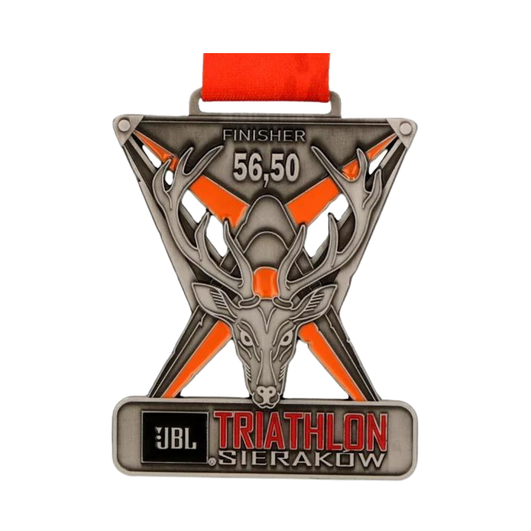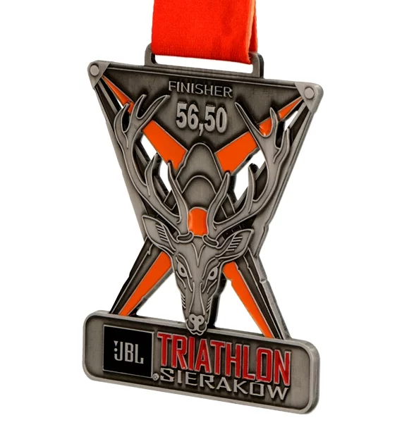 Medal odlewany 2D z ażurami i wypełnieniem emalią dla Triathlon Sieraków, to coroczna impreza rozgrywająca się na trzech dystansach ⅛, ¼ , ½ dystansu pełnego triathlonu.