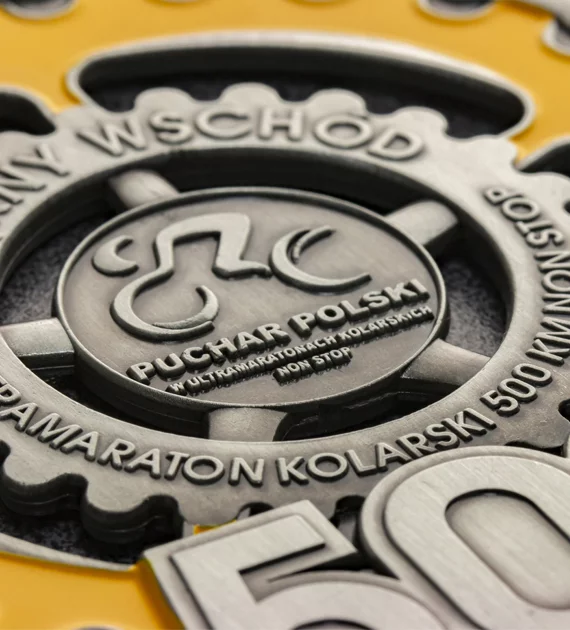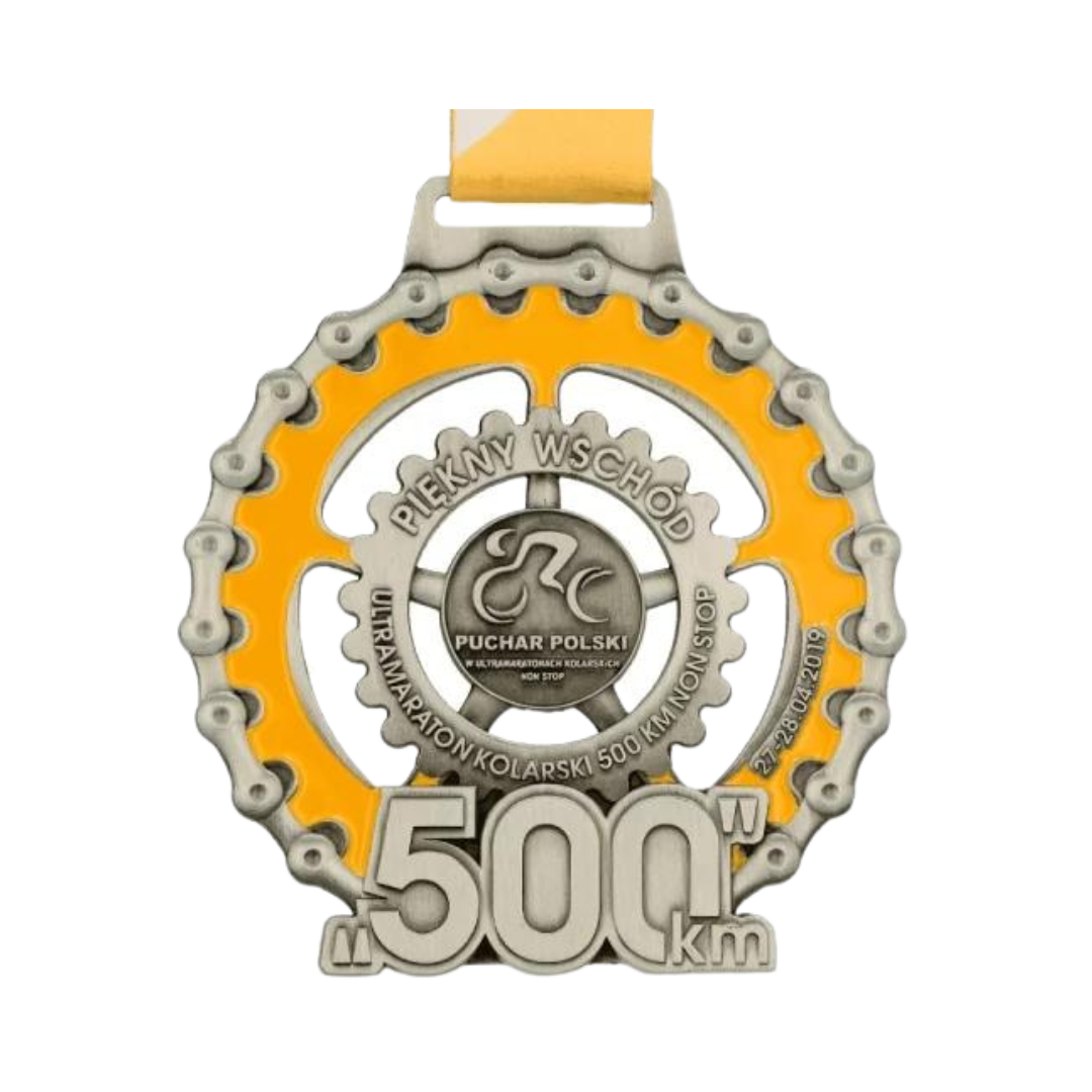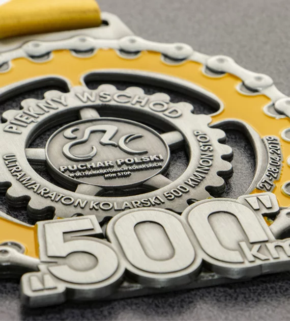 Medal odlewany 2D dla wyścigu rowerowego na dystansie 500 km. Zębatka oraz łańcuch zostały sprytnie wplecione w okrągły kształt medalu wypełniony żółtą emalią. Setki zapalonych rowerzystów mogło na mecie otrzymać nasz medal.