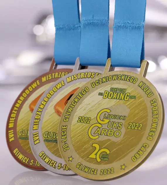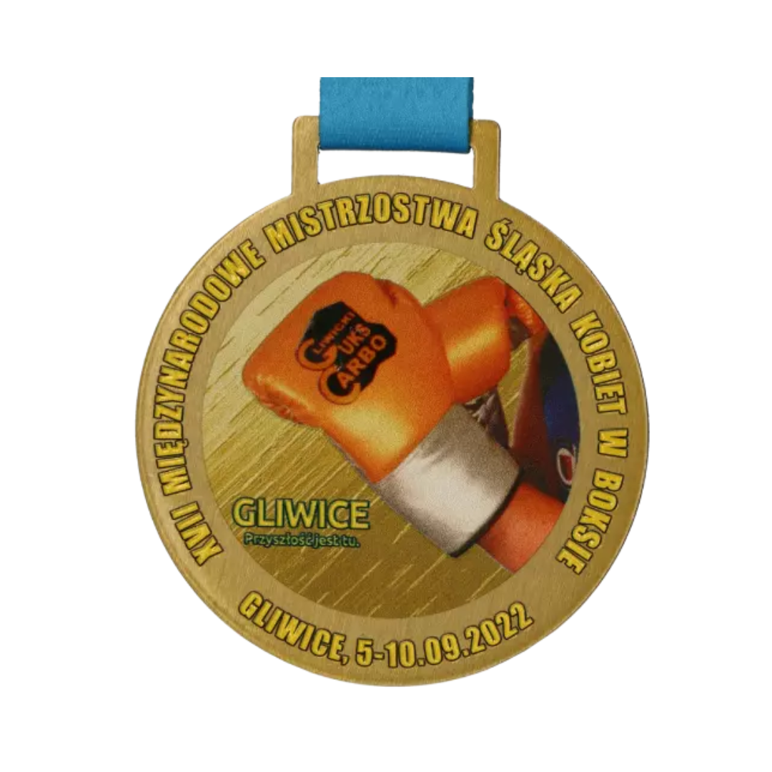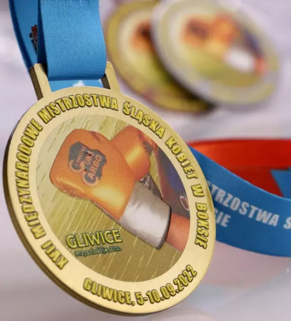 Medal stalowy Q-Medals z dwustronnym nadrukiem UV wykonany na XVII Mistrzostwa Śląska Kobiet w Boksie. Zawody odbywały się w Gliwicach.