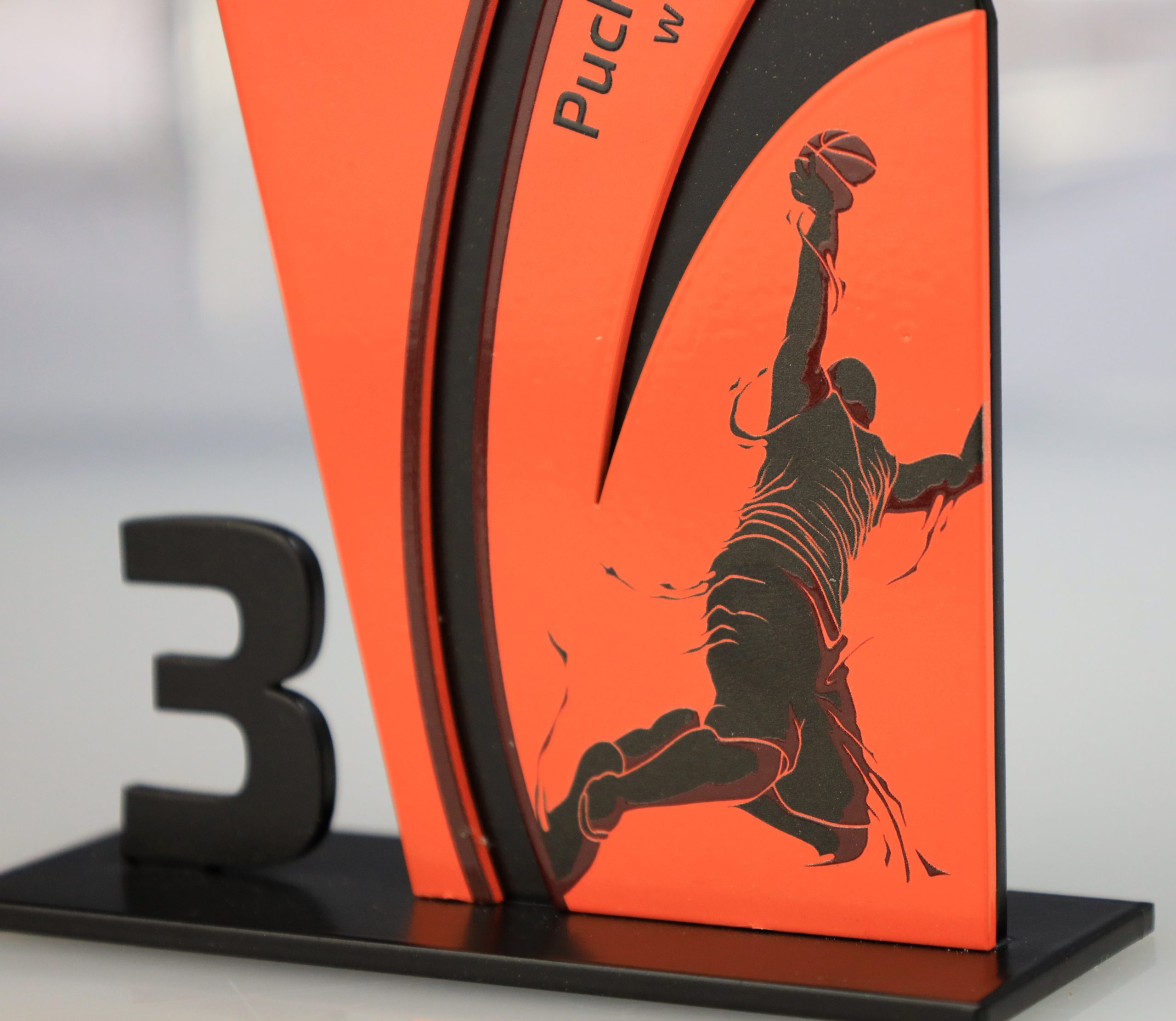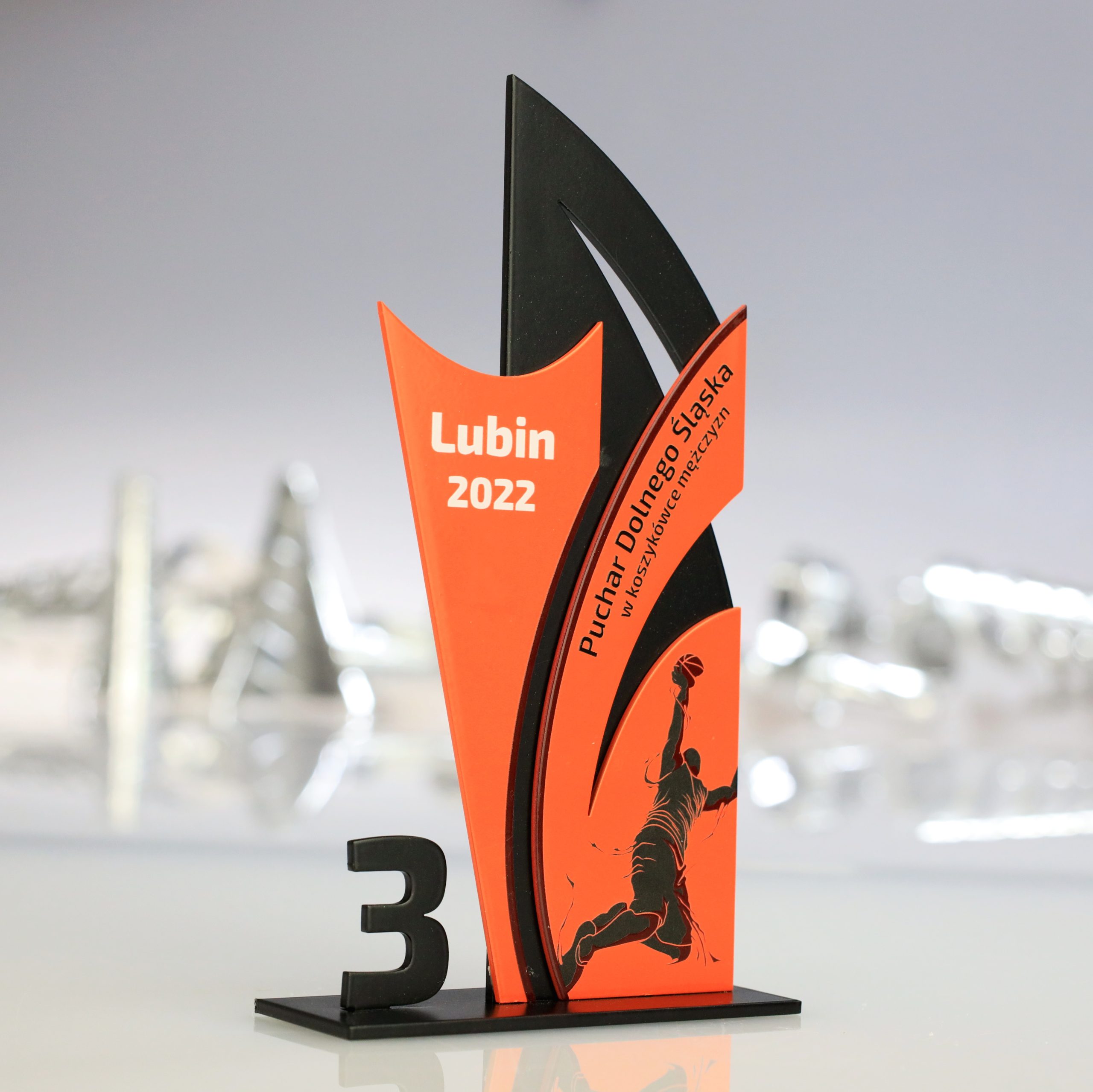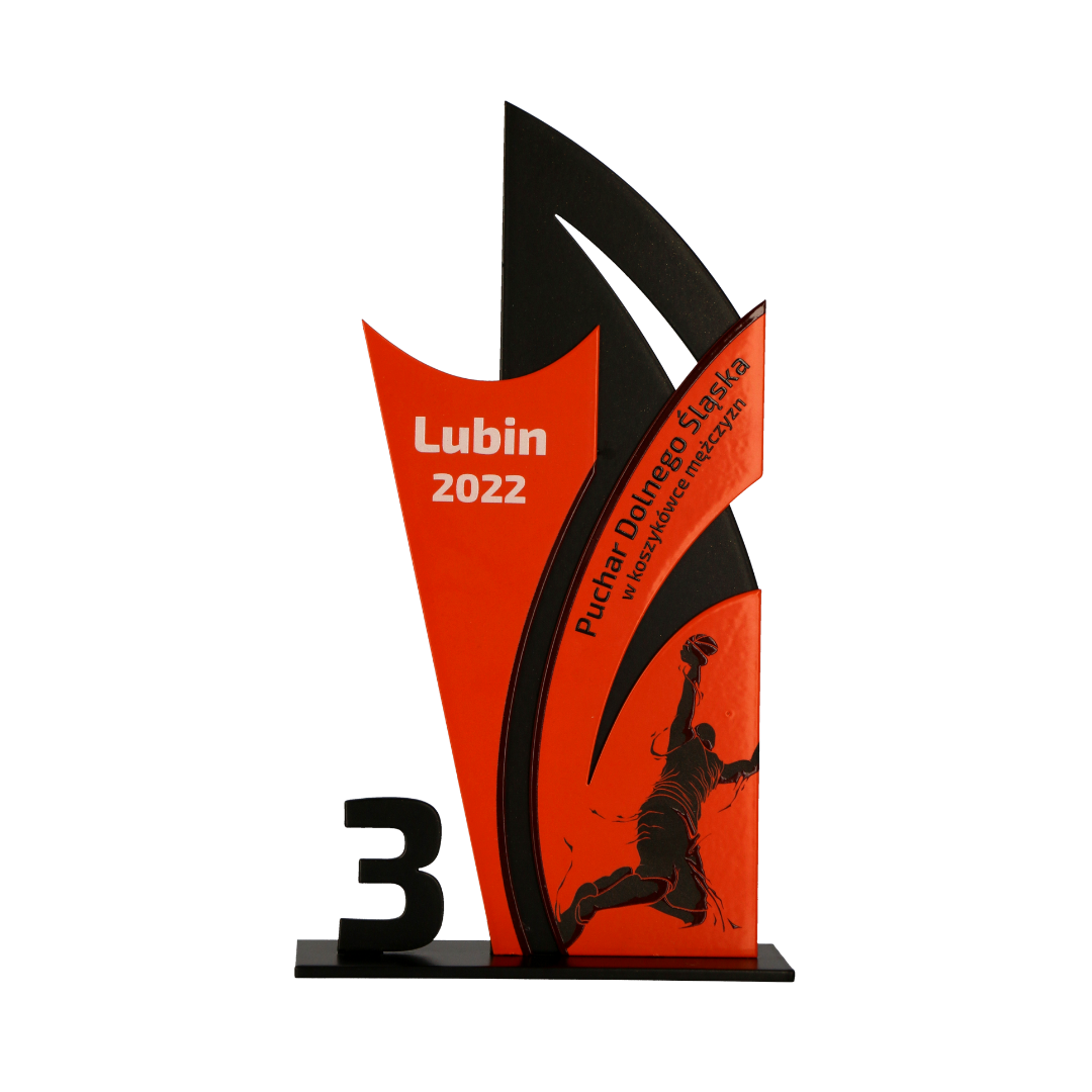 Statuetka metalowa, także na metalowej podstawie. Wykonana na Mistrzostwa Dolnego Śląska w Koszykówce Mężczyzn.