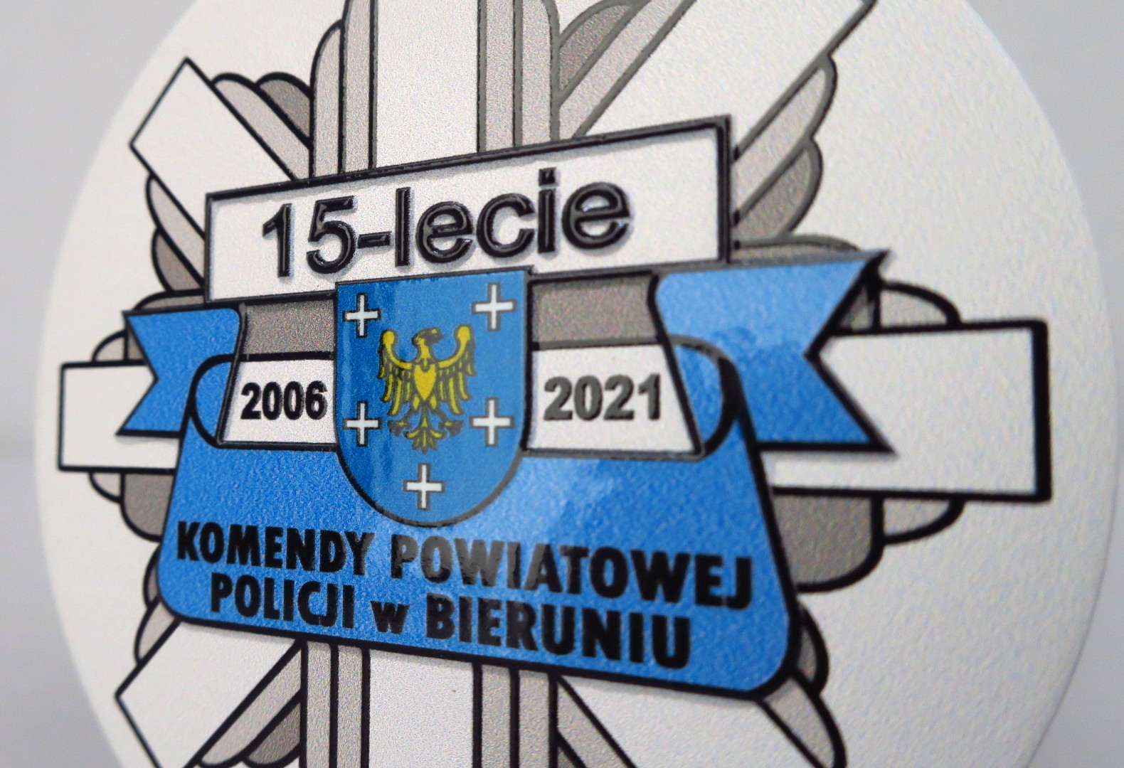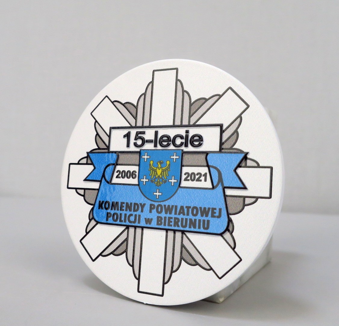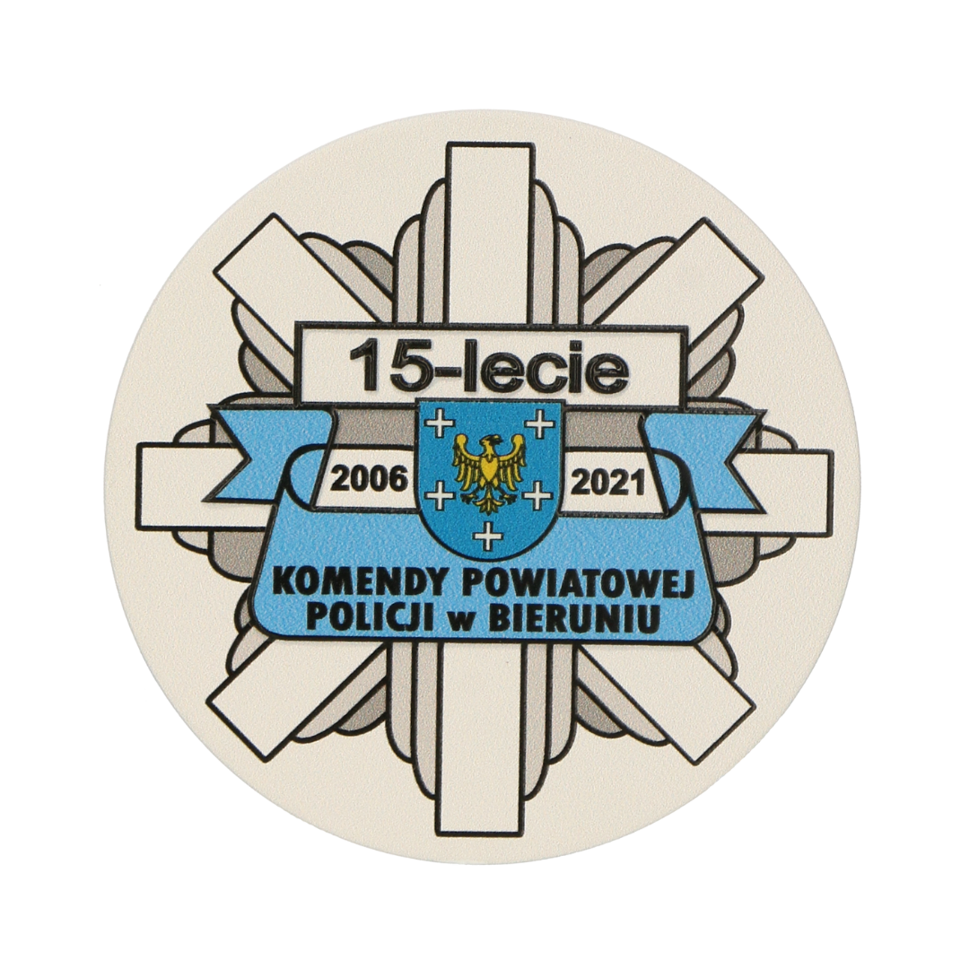 Moneta wycinana laserowo, stworzona na podstawie medali Lasercut tyle ze tym razem nie dodaliśmy uchwytu na wstążkę ponieważ na 15 lecie Komendy Policji w Bieruniu klient zdecydował się na opcję monety zamiast medalu. Moneta to zdecydowanie lepszy pomysł aby uczcić różnego rodzaju jubileusze, możemy umieścić ją w eleganckim etui. Monetę wykonaliśmy w białym kolorze bazowym oraz nanieśliśmy warstwowy nadruk UV.
