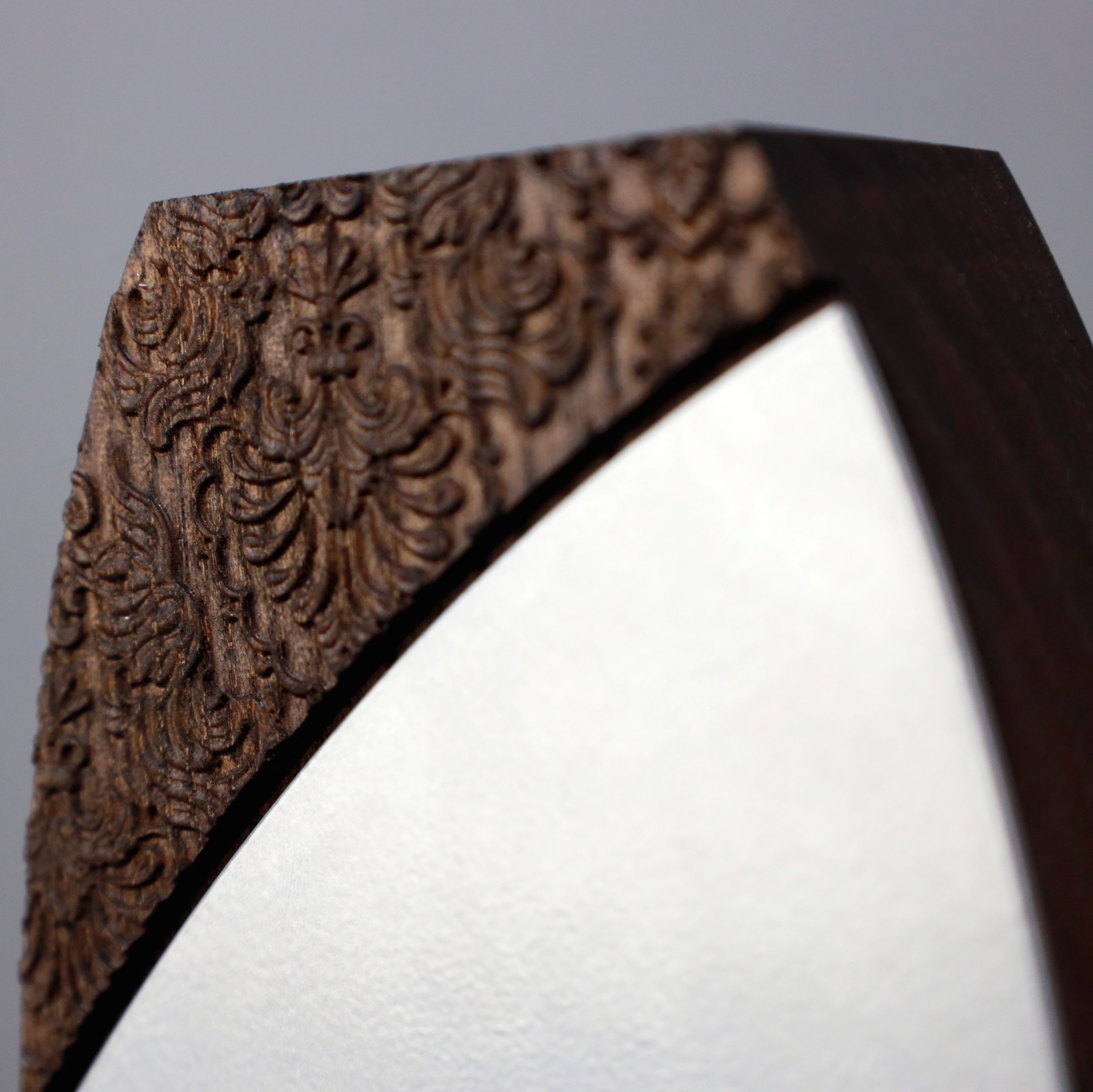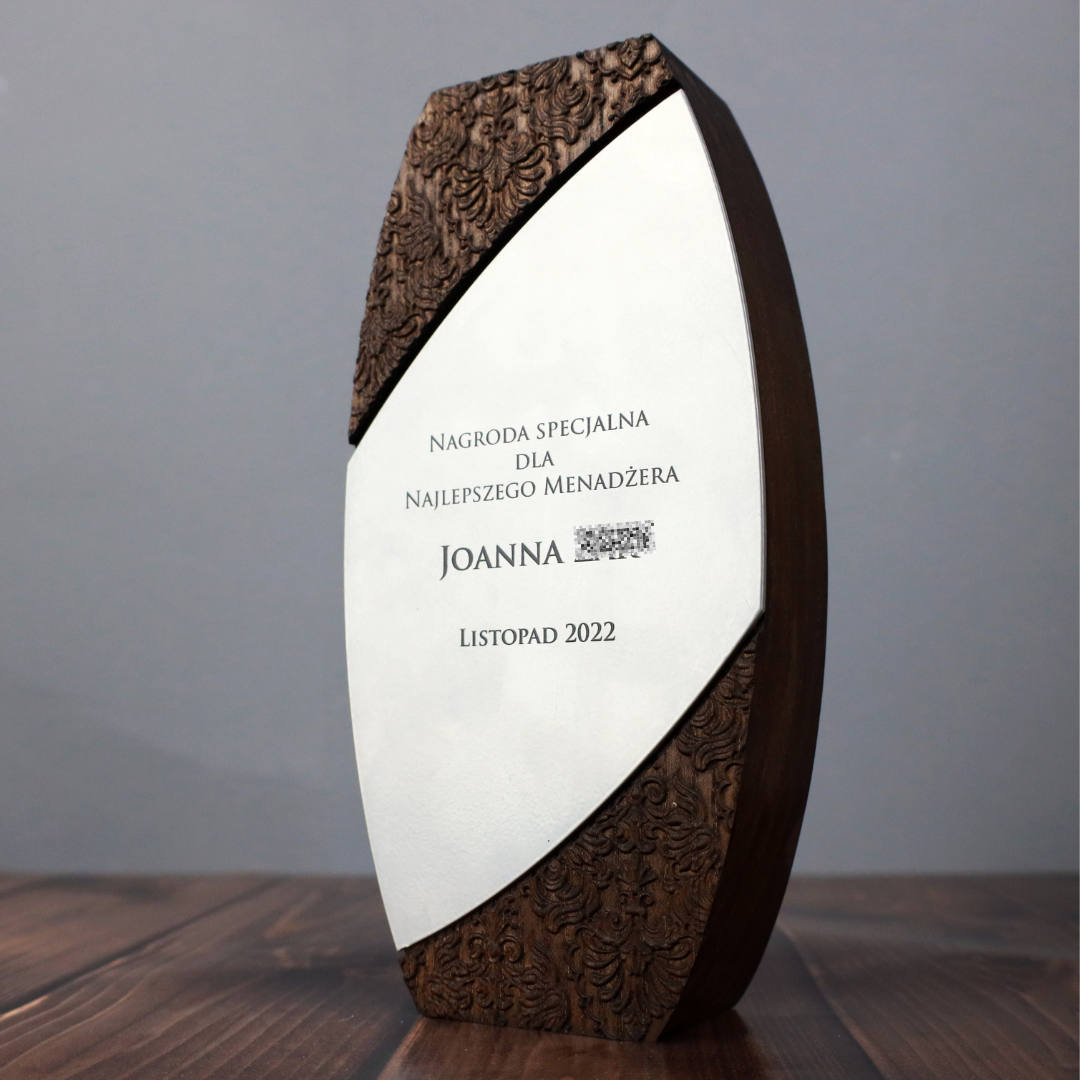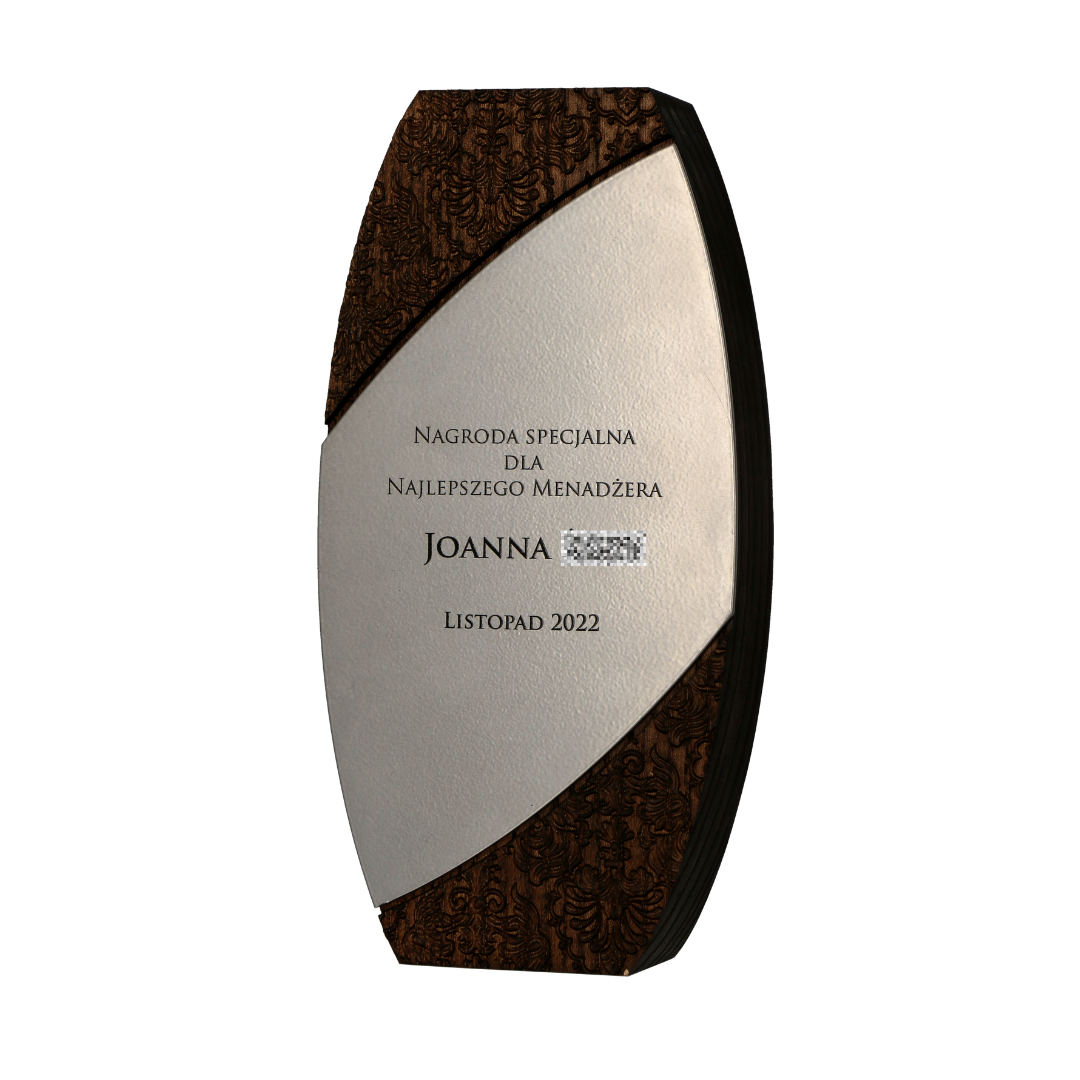 Statuetka wykonana z drewna połączonego z metalem. Na drewnie wykonano frezy, które fantastycznie łączą się z brązowym drewnem i metalowym panelem przymocowanym do całości statuetki. Na metalowej części wykonaliśmy grawer.