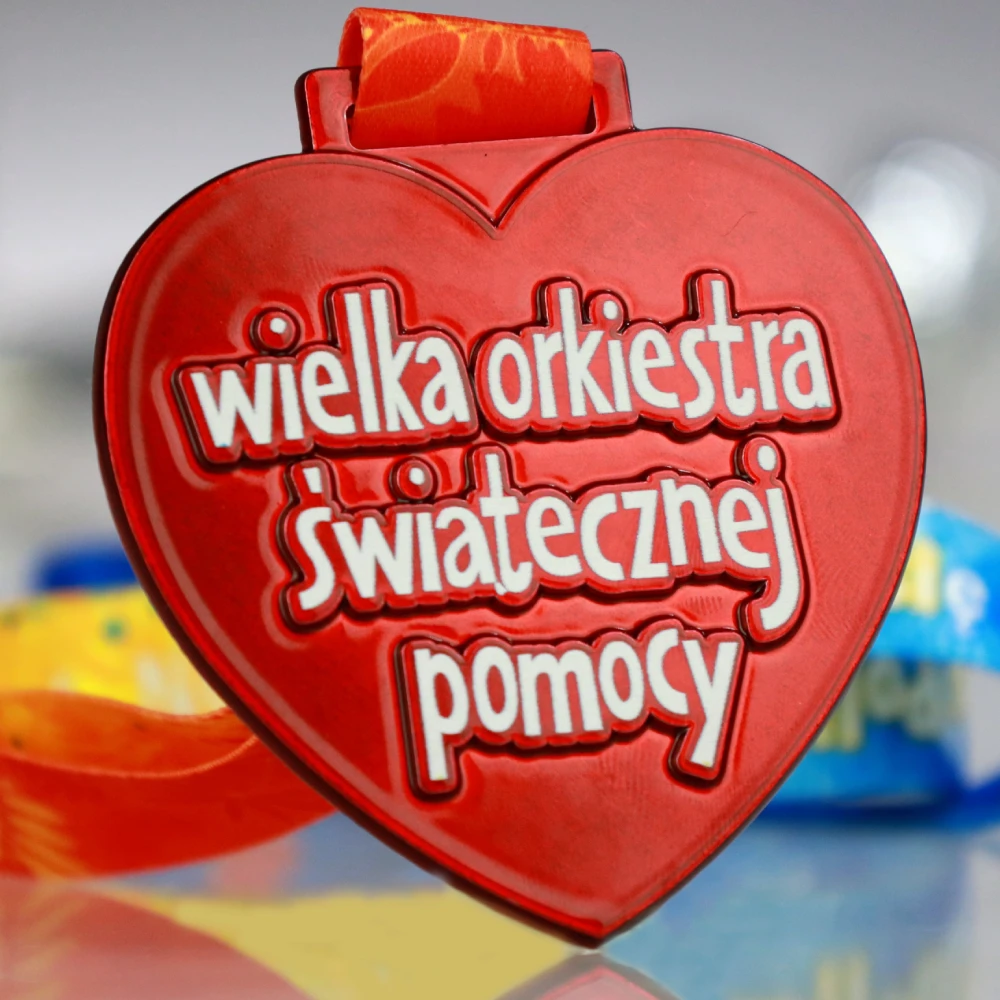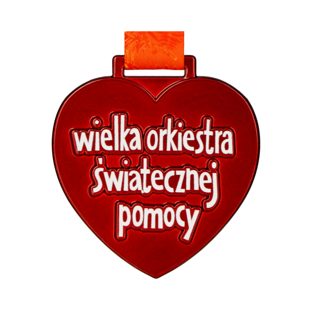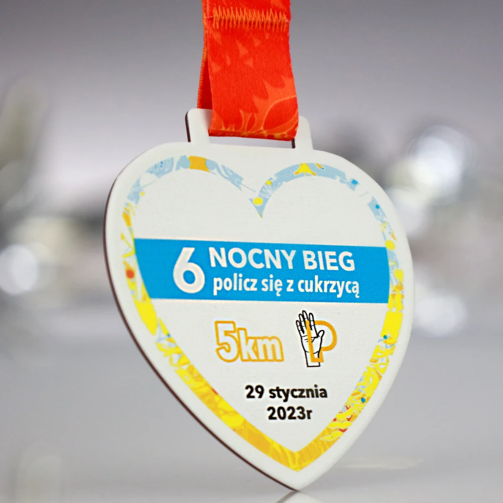 Medal stalowy Lasercut wycinany laserowo w kształcie serca WOŚP z dwustronnymi nadrukiem stworzony na 6 Nocny Bieg Policz Się z Cukrzycą. Czasami ten najprostszy pomysł okazuje się najlepszy, tak było w tym przypadku gdzie przełożenie klasycznego logo – serduszka WOŚP znakomicie sprawdziło się w roli medalu.