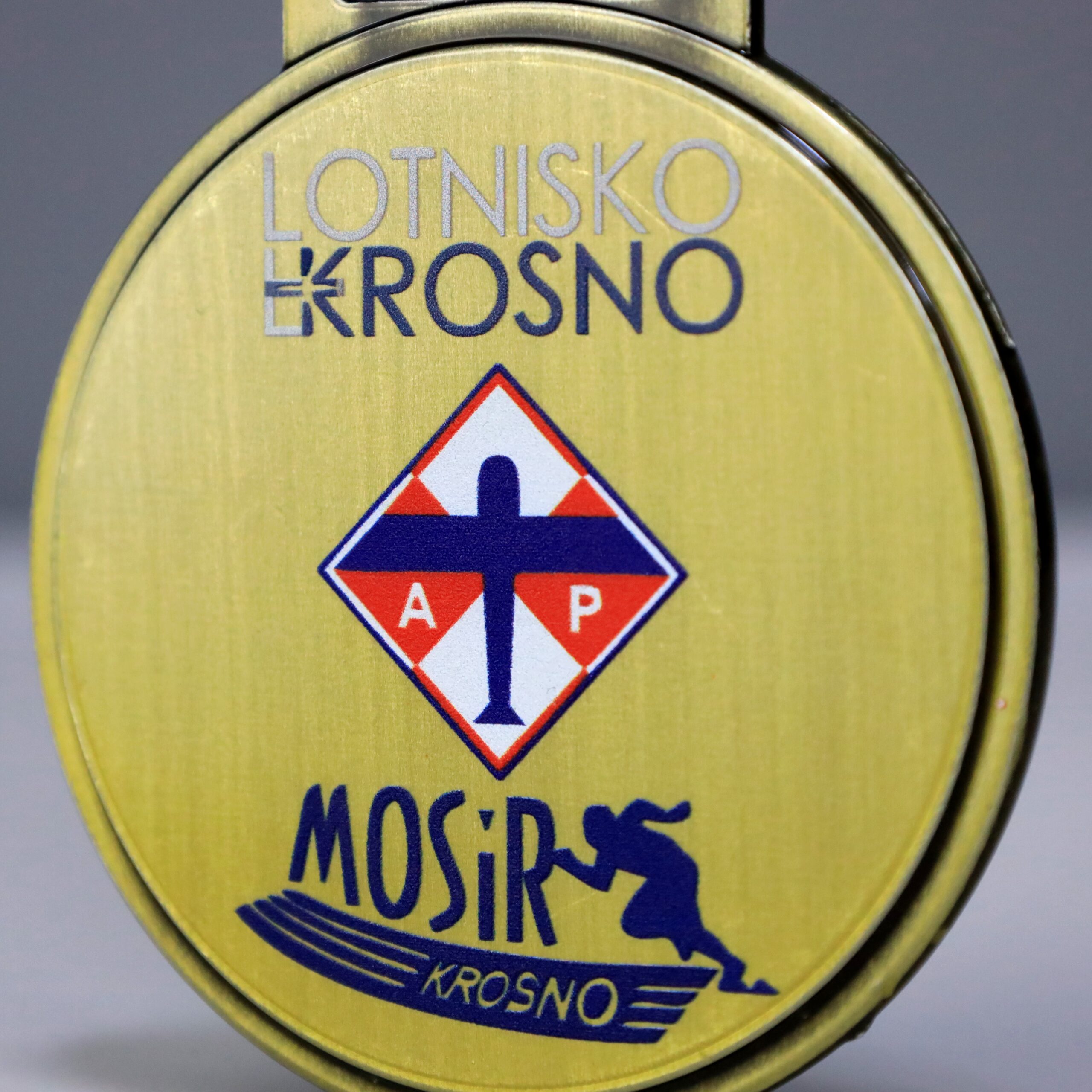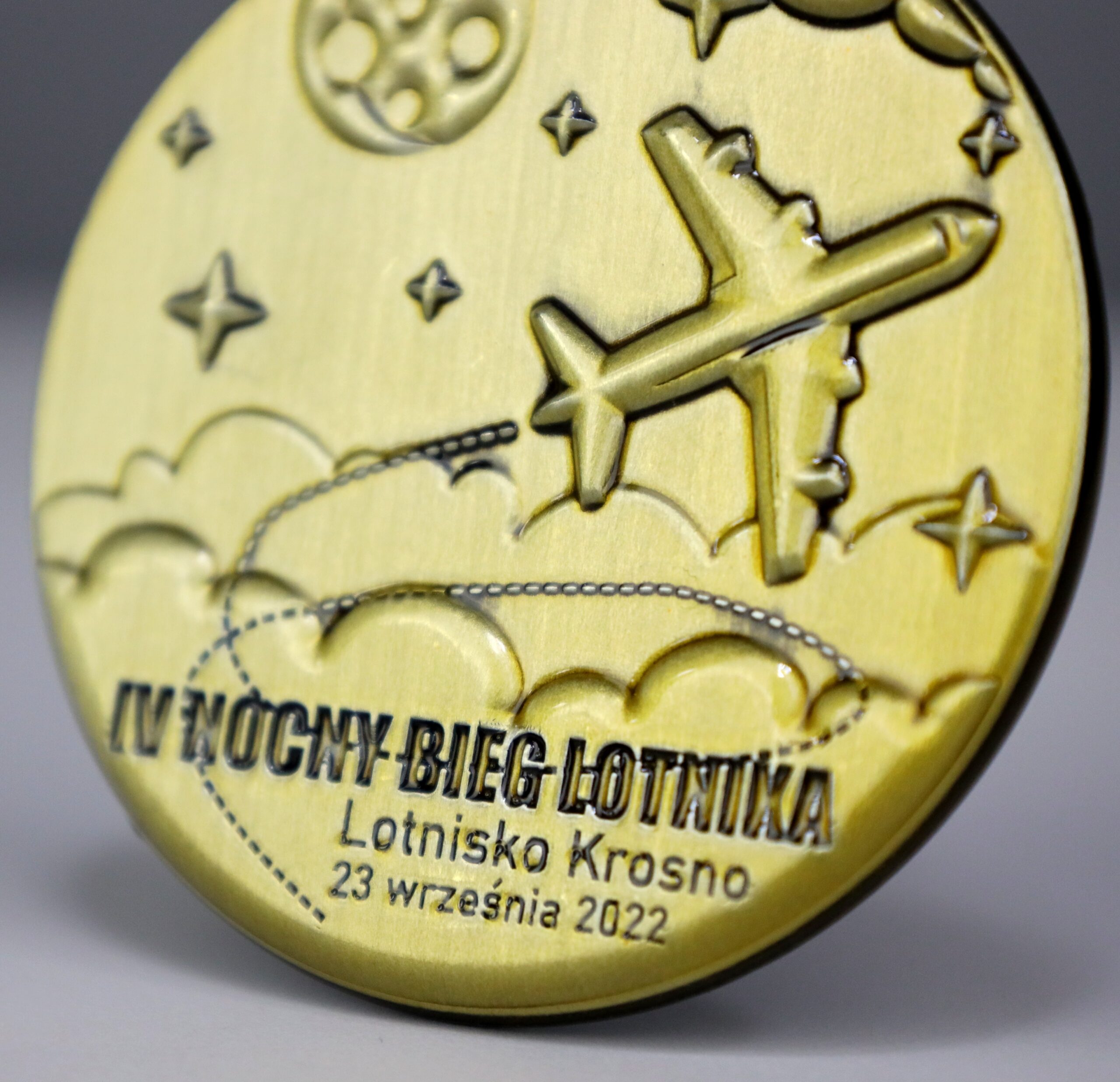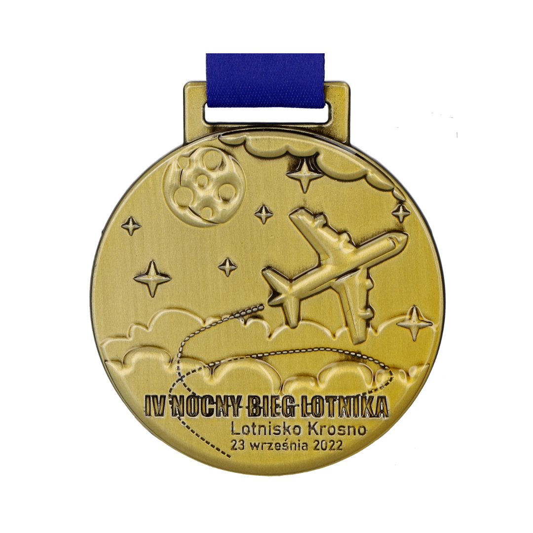Medal odlewany 3D dwustronny w kolorze złotym. Medal przygotowany na IV Nocny Bieg Lotnika który odbywał się na krośnieńskim lotnisku. Medal został zaaranżowany z dwóch stron, z jednej mamy przetłoczenia 3D, z drugiej na płaskiej powierzchni z fakturą wykonaliśmy nadruk UV. Nagroda przedstawia samolot wzbijający się ku niebu w blasku gwiazd oraz księżyca.