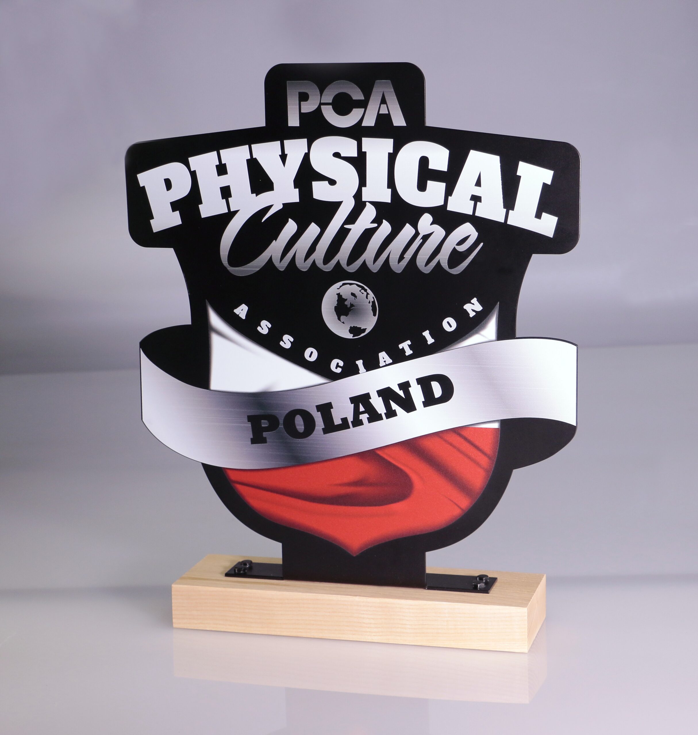 Statuetka metalowa z drewnianą podstawą wykonana na zawody kulturystyczne PCA Poland. Ta masywna statuetka idealnie wkomponowała się w konkurs w którym organizatorzy nagradzali najlepiej umięśnione kobiety oraz mężczyzn w kilku kategoriach.
