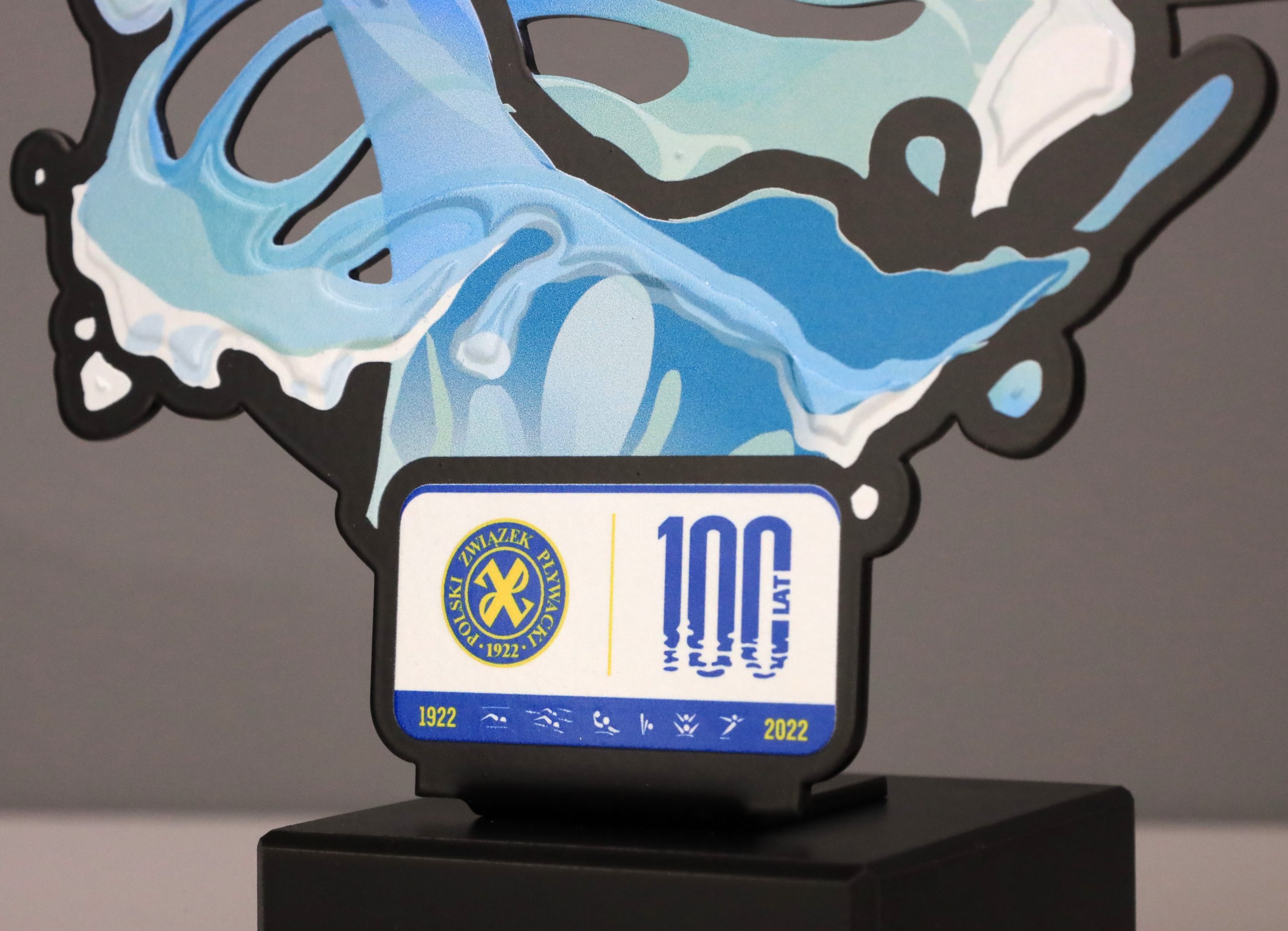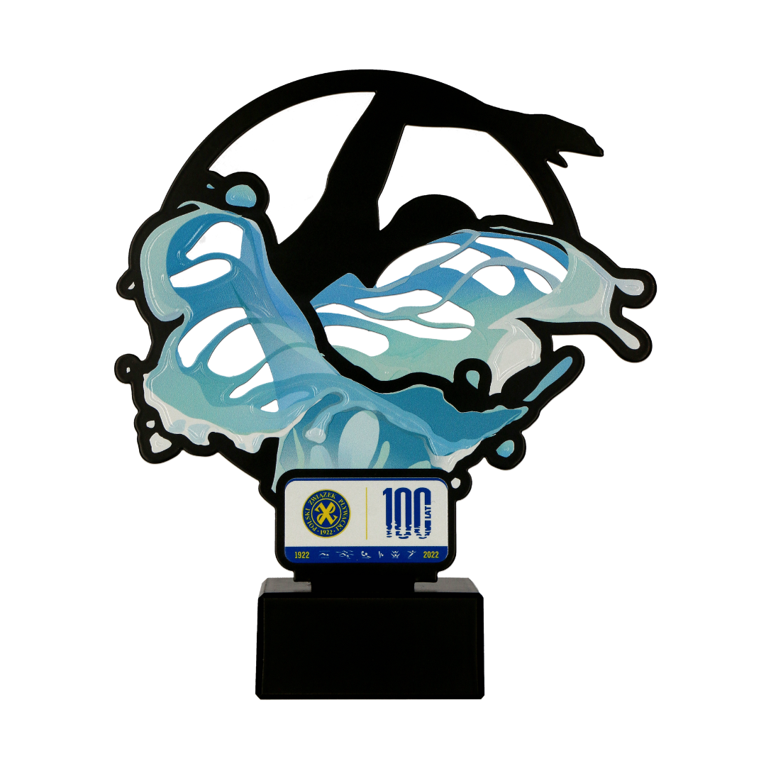 Statuetka metalowa na marmurowej podstawie z okazji 100 lecia Polskiego Związku Pływackiego. Trofeum wykonane techniką cięcia laserowego oraz wielowarstwowego nadruku UV.