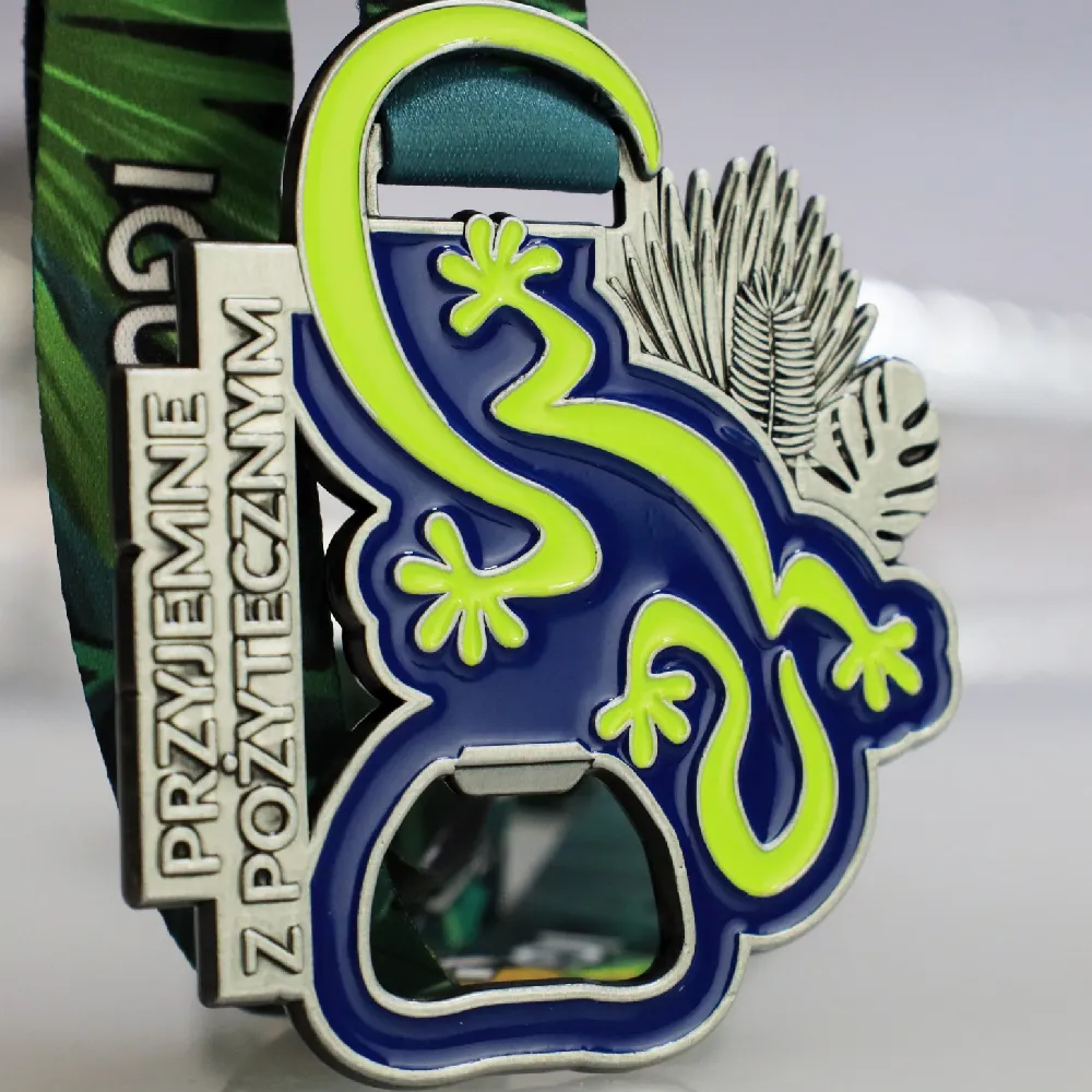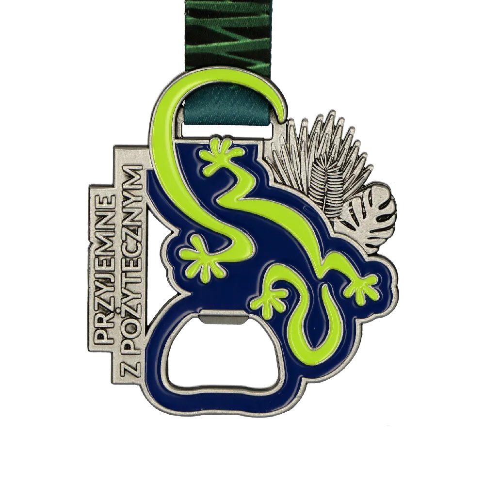 Nagroda ma ciekawe zastosowanie bowiem oprócz medalu znajdzie swoje miejsce w kuchennej szufladzie jako otwieracz do butelek! Innowacyjny wzór z emaliowaniem awersu medalu-powyżej 30% powierzchni i przetłoczeniami na rewersie. Przyjemnie dostać taki medal, a do tego pożytecznie otworzyć nim butelkę z napojem gazowanym 🙂
