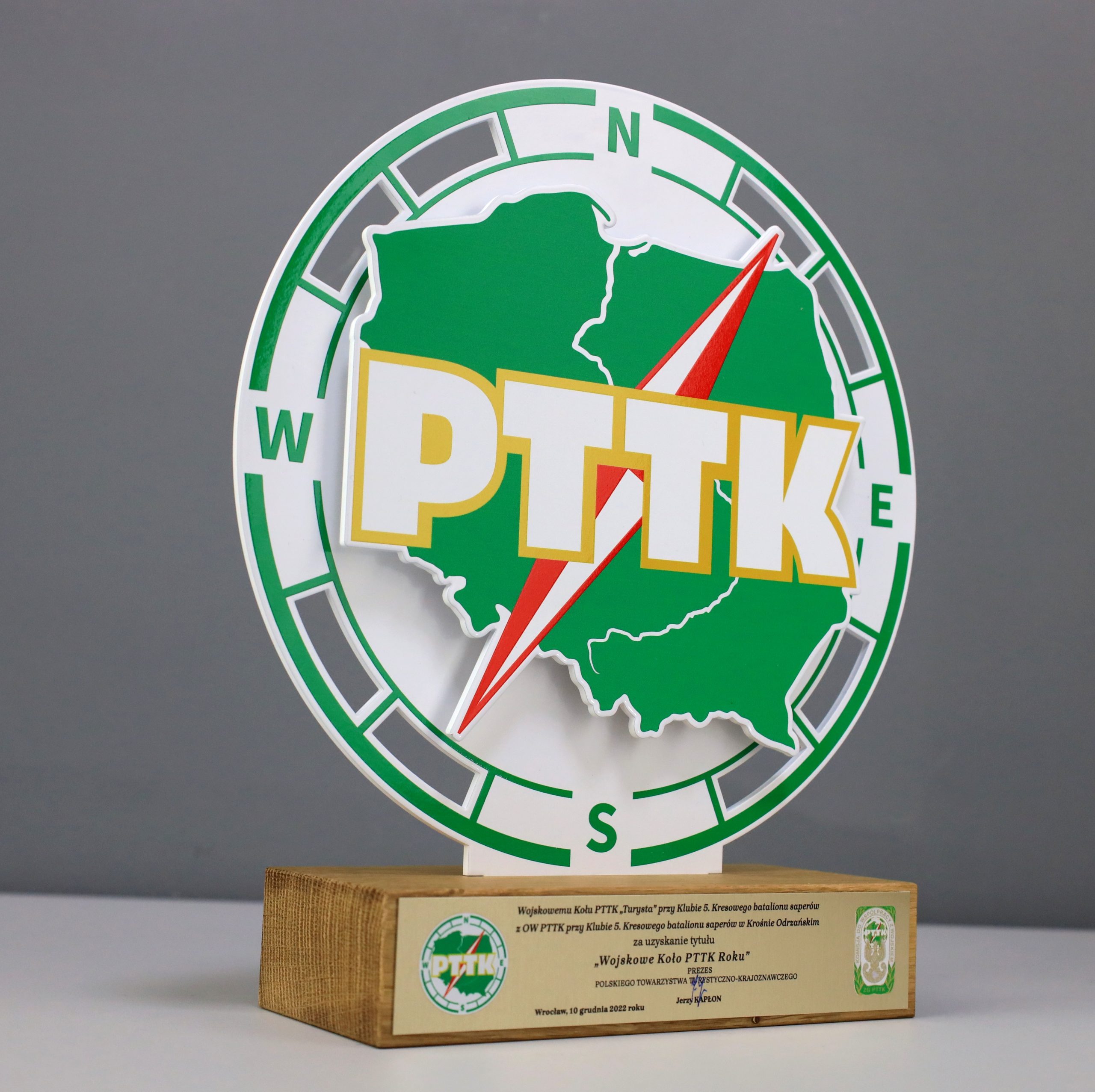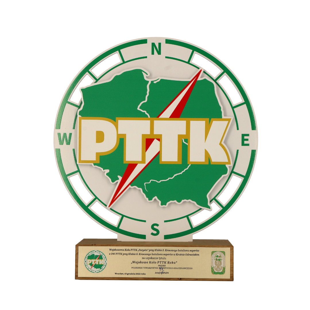 Statuetka wielomateriałowa, na podstawie drewnianej oraz panelu metalowym do którego przymocowany został drugi panel tym razem z plexi. Nagroda została wykonana na zlecenie Polskiego Towarzystwa Turystyczno-Krajoznawczego i wręczona dla batalionu saperskiego w Krośnie Odrzańskim za uzyskanie tytułu „Wojskowe Koło PTTK Roku”.