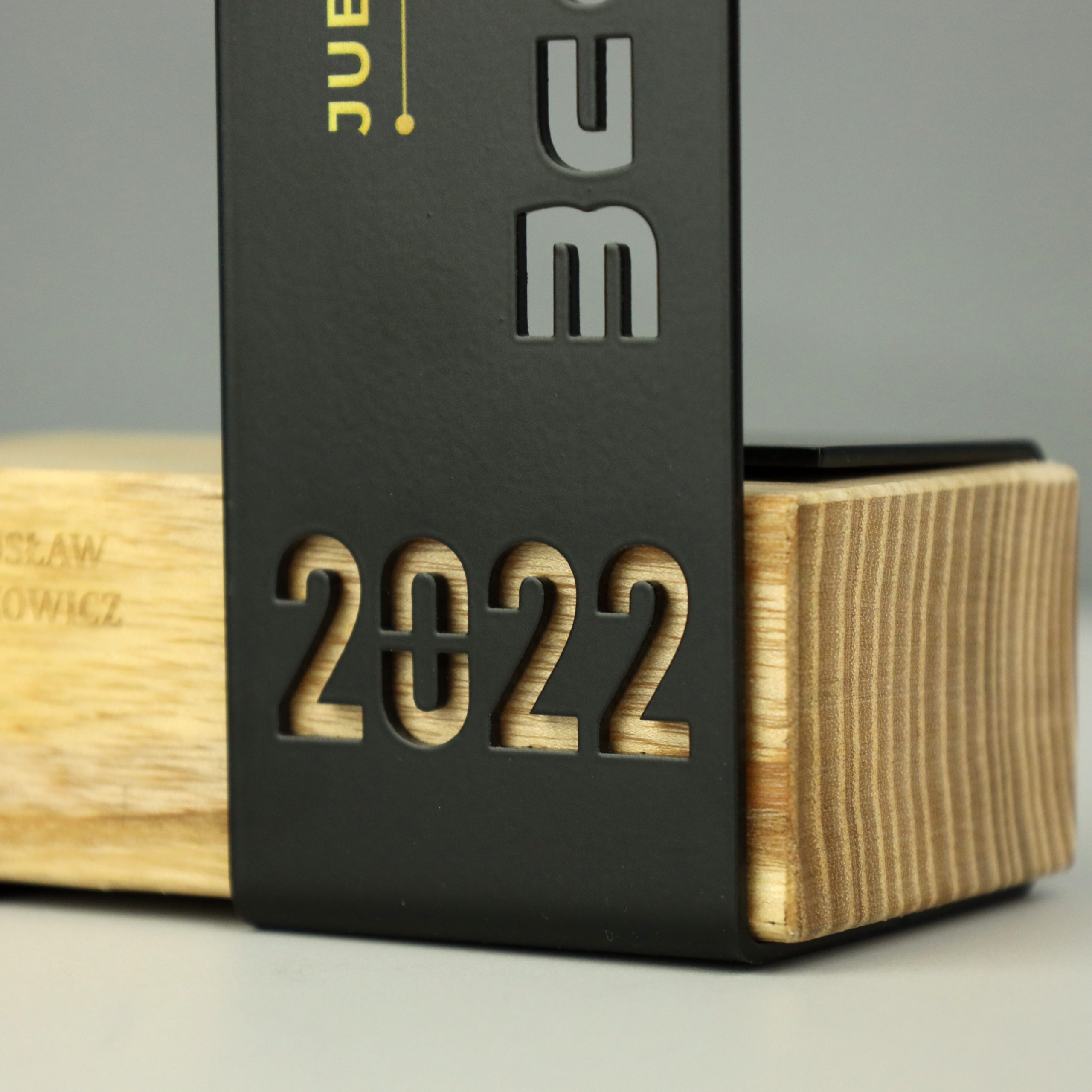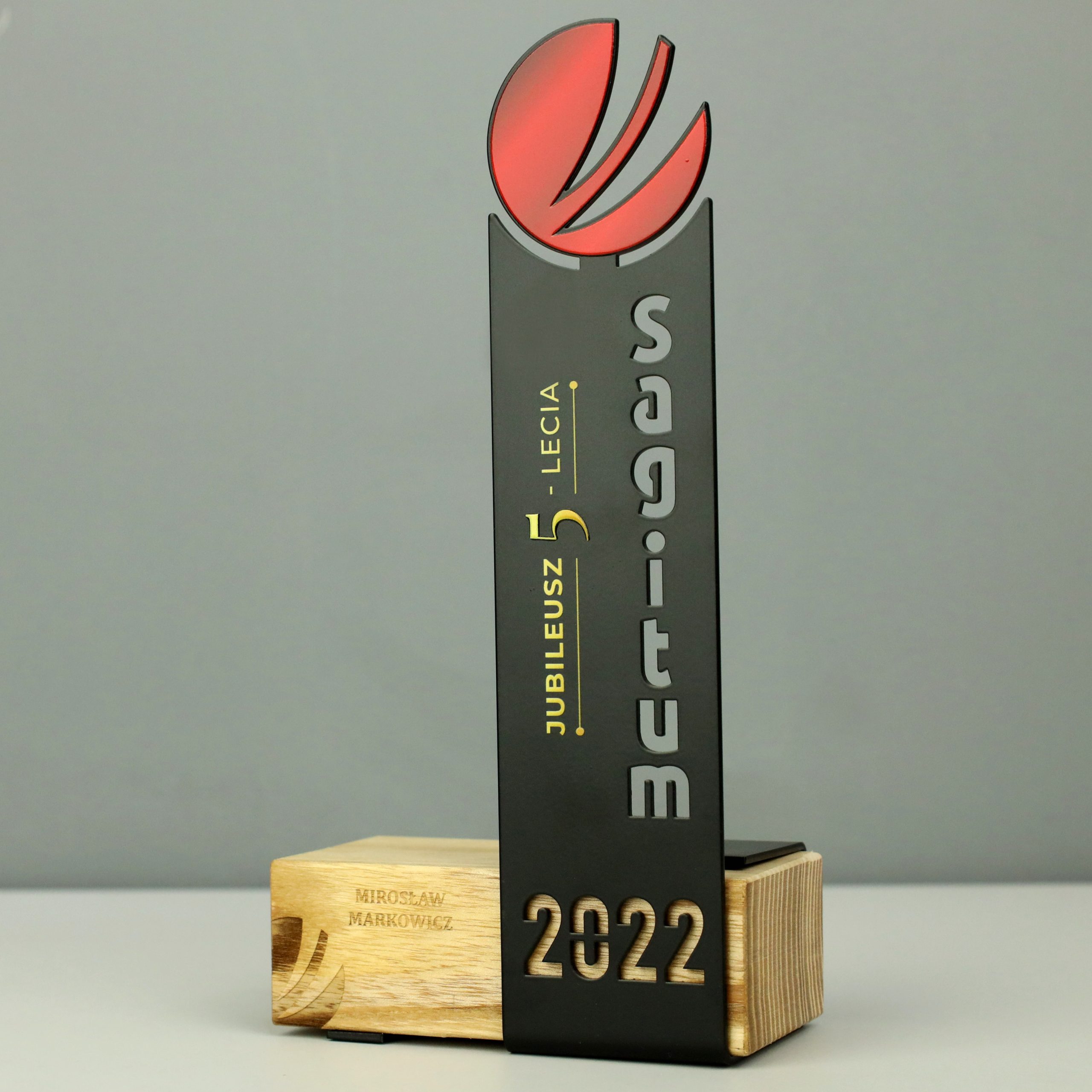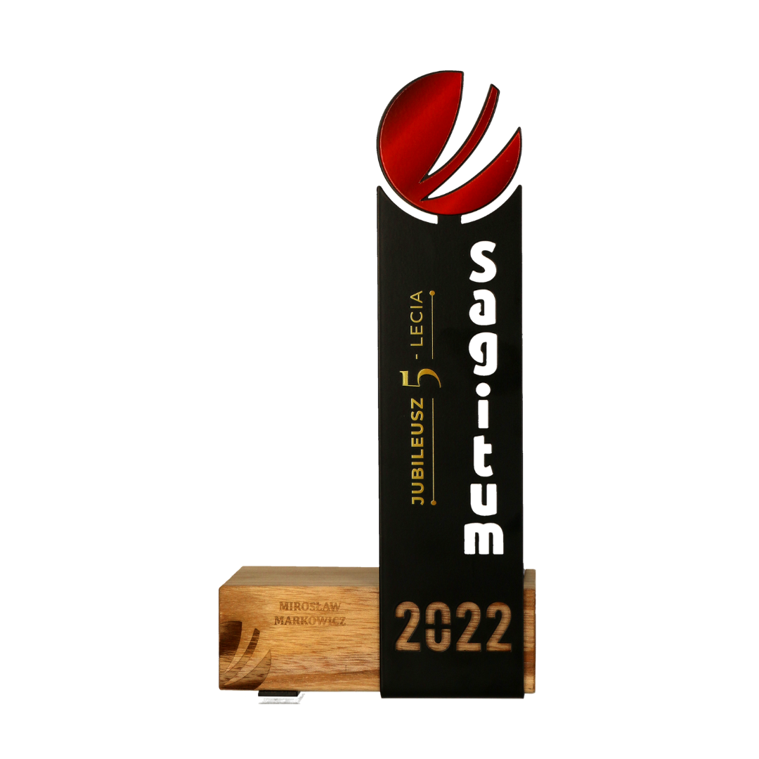 Statuetka metalowa na drewnianej podstawie w którą wpasowany został metalowy panel wycinany laserowo. Statuetka została stworzona na 5 lecie firmy Sagitum. Firma wręczała statuetki wszystkim swoim pracownikom w ramach podziękowania i uznania za zaangażowanie.