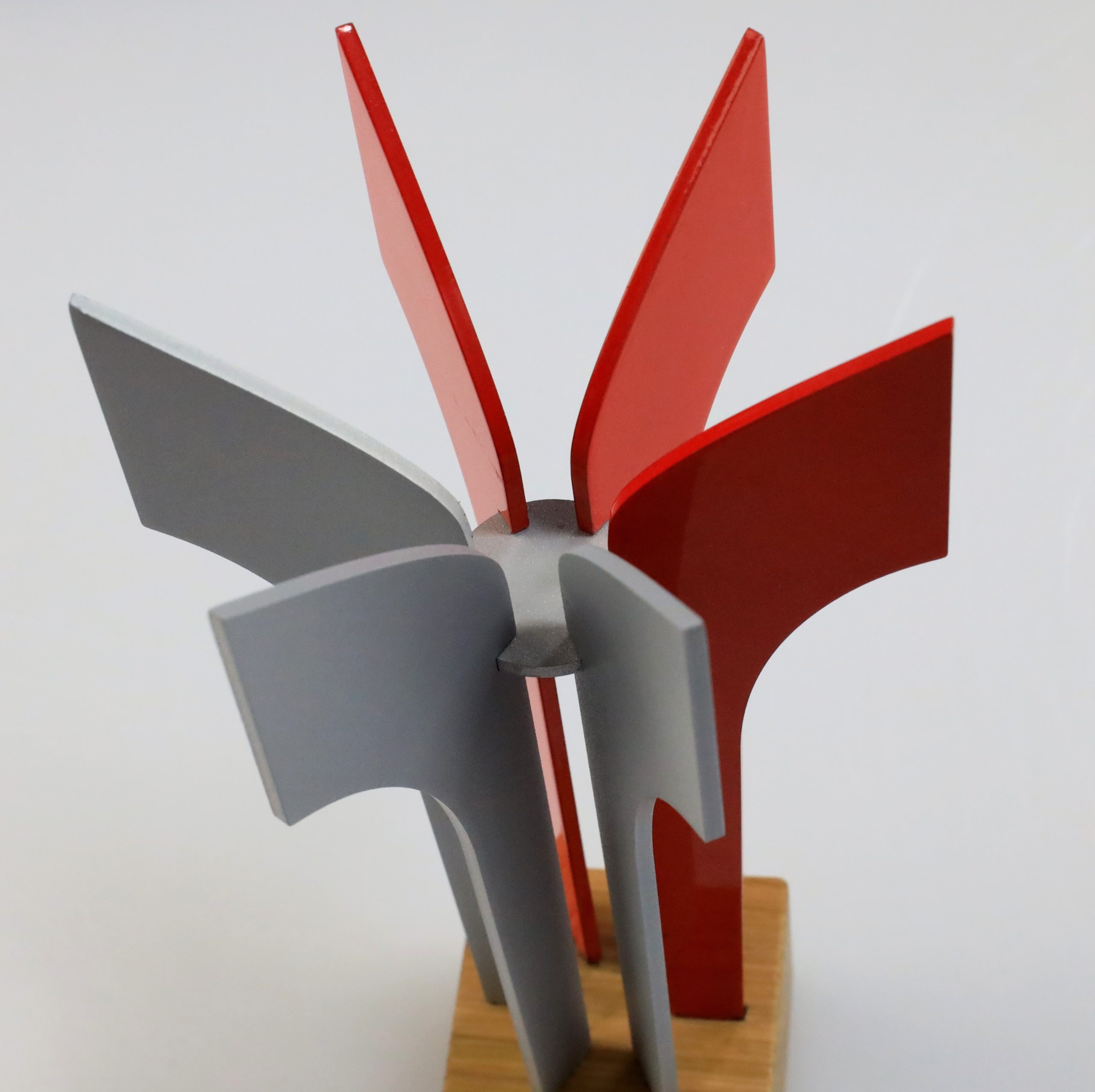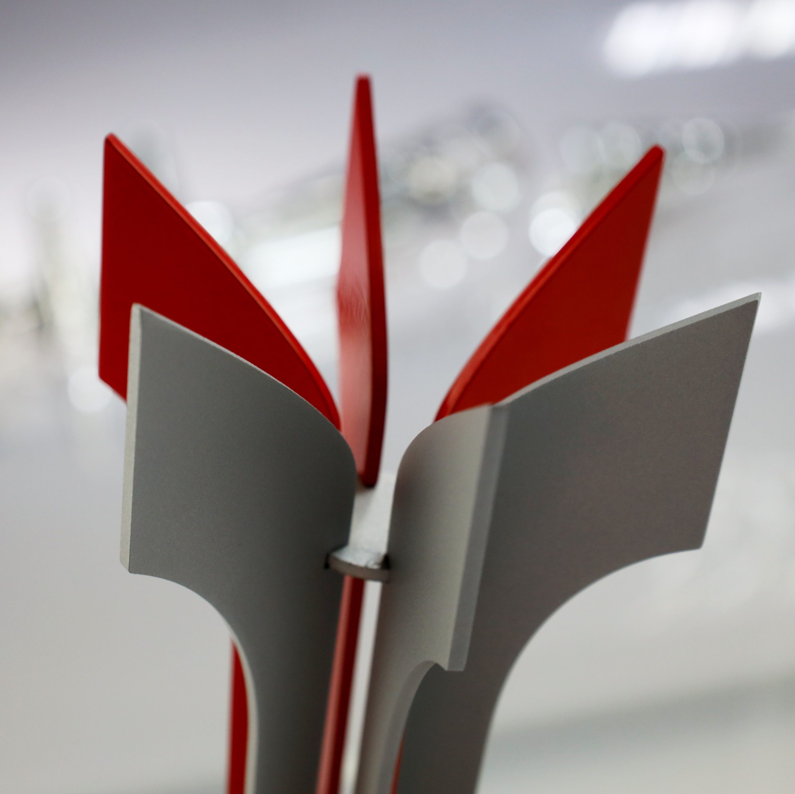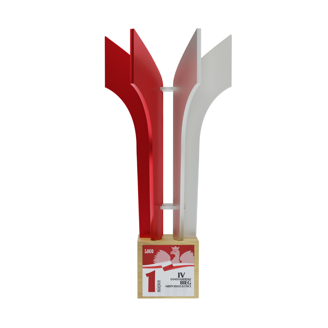 Statuetka przestrzenna, wielomateriałowa na drewnianej podstawie. Stworzona na IV Bieg Niepodległości w Sandomierzu. Całość tworzą metalowe panele połączone w całość na drewnianej podstawie. Nagroda zdecydowanie wyróżnia się swoją formą przestrzenną którą możemy tworzyć dzięki naszemu najnowocześniejszym fabrykom.
