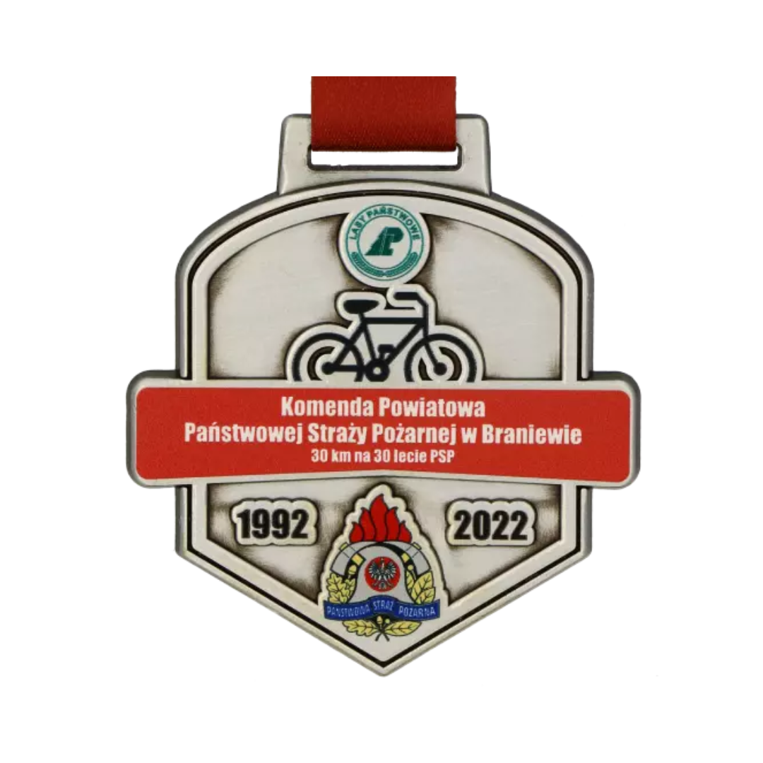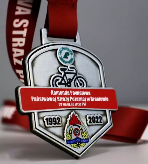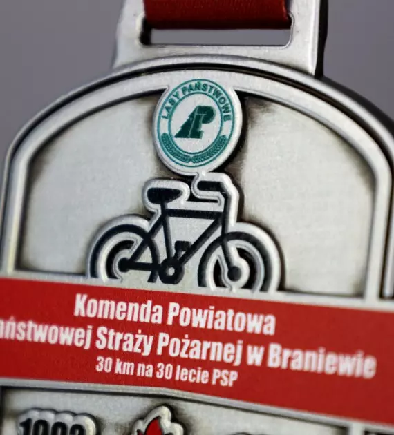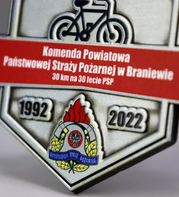 Medal odlewany Vision z nadrukiem UV na 30 lecie Państwowej Straży Pożarnej w Braniewie i rajd rowerowy zorganizowany z okazji tego jubileuszu. Medale Vision charakteryzują się możliwością ponownego wykorzystania odlewu, a nadruk możemy zaprojektować na nowo, to innowacyjny sposób na oszczędność i imprezy odbywające się cykliczne.