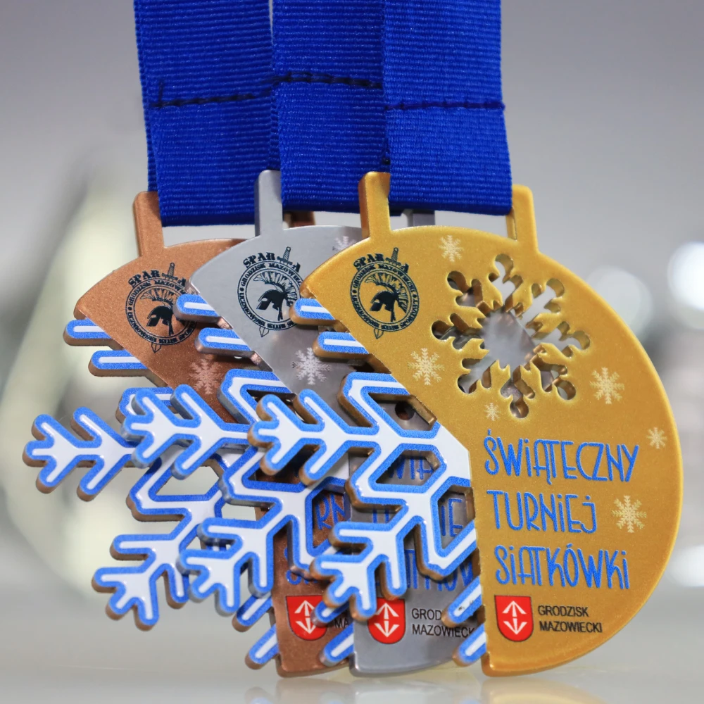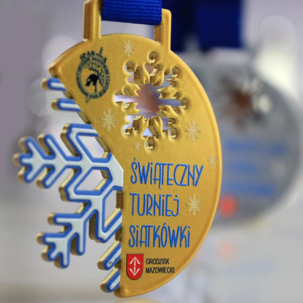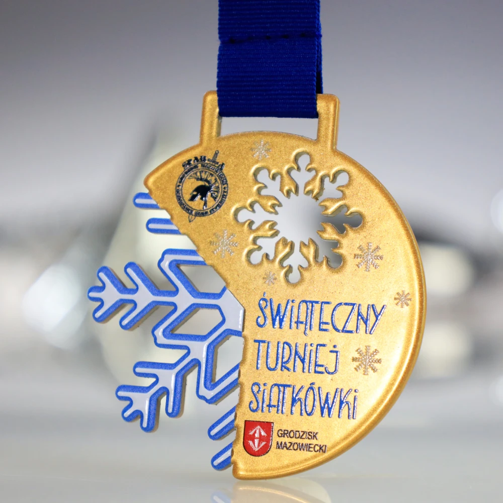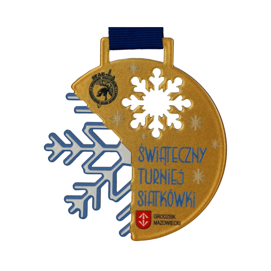 Medal stalowy, wycinany laserowo z serii Lasercut na Świąteczny Turniej Siatkówki. Medal wykonaliśmy w 3 kolorach, zachowując świąteczny klimat z motywem płatków śniegu. Turniej w Grodzisku Mazowieckim przyniósł wiele sportowej rywalizacji a zawodniczki z miejsc 1-3 otrzymały nasze personalizowane medale.