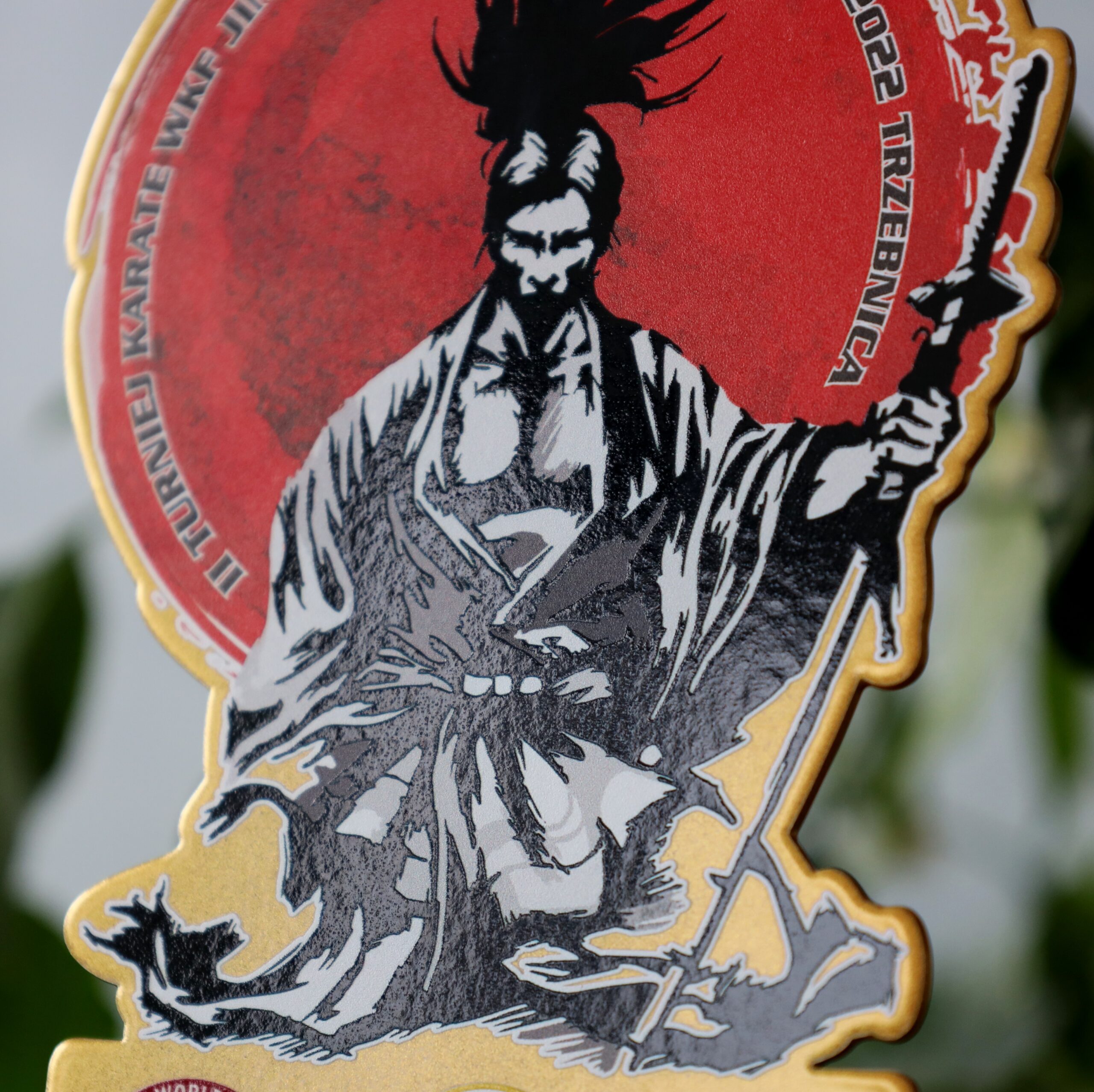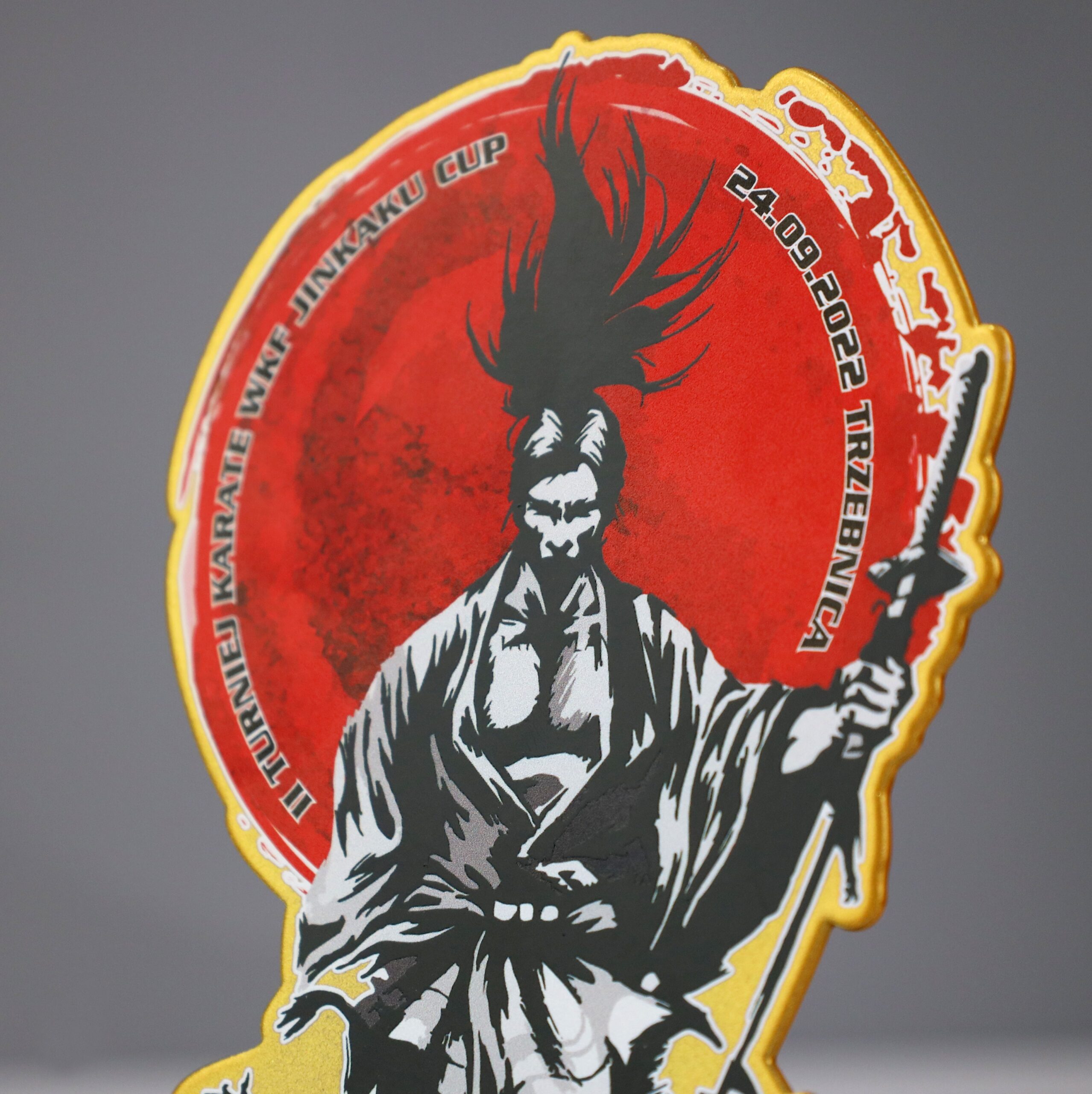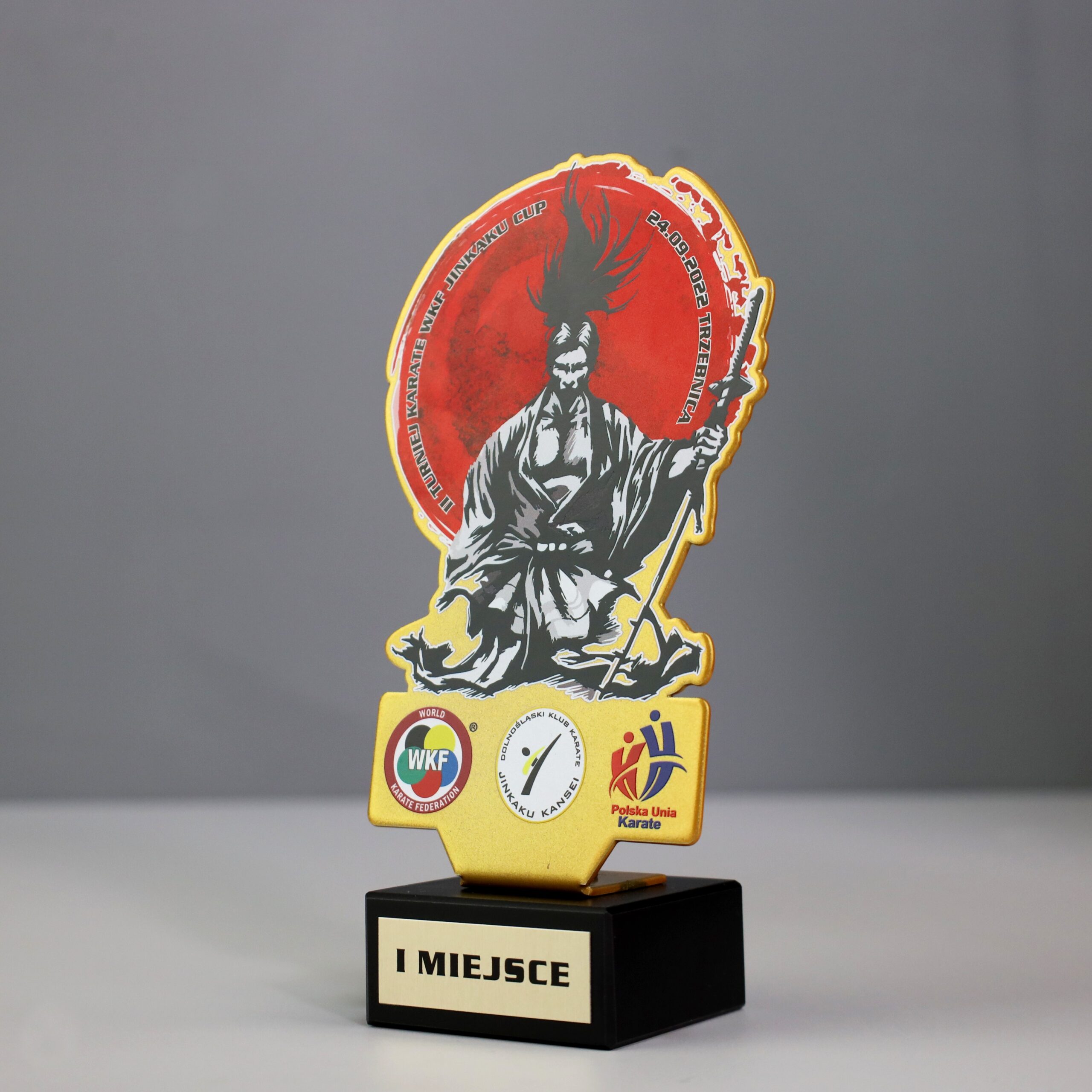 Statuetka metalowa wycinana laserowo, osadzona na marmurowej podstawie. Na statuetkę naniesiono warstwowy nadruk UV przedstawiający postać samuraja. Nagrodę wykonaliśmy na turniej karate Jinkaku Kanesi w Trzebnicy.