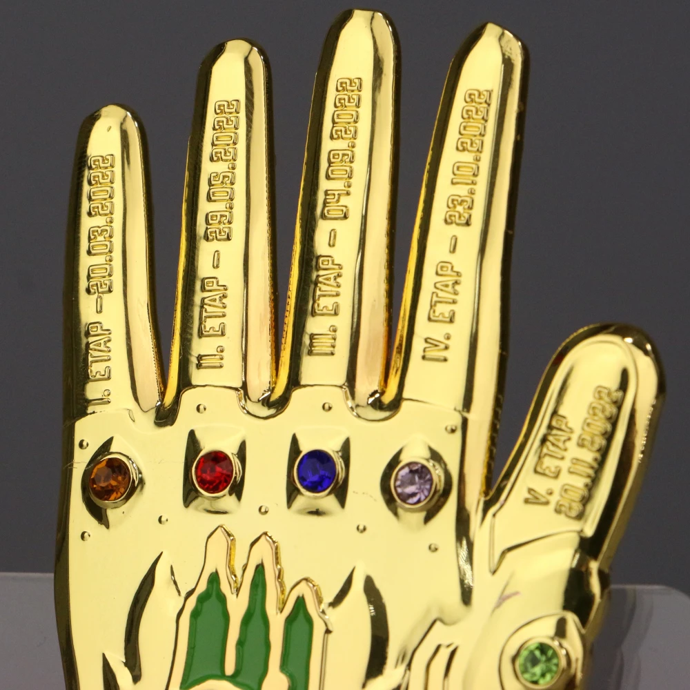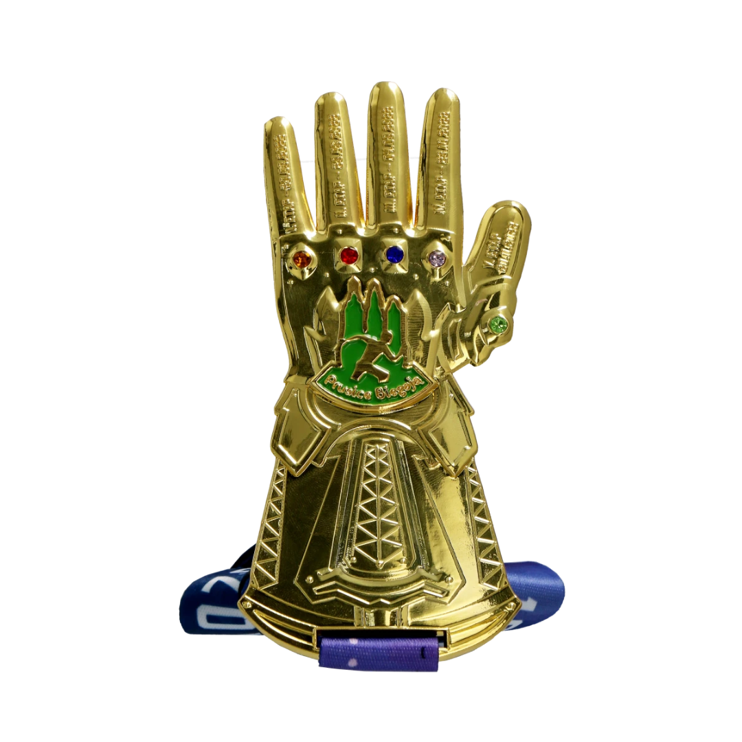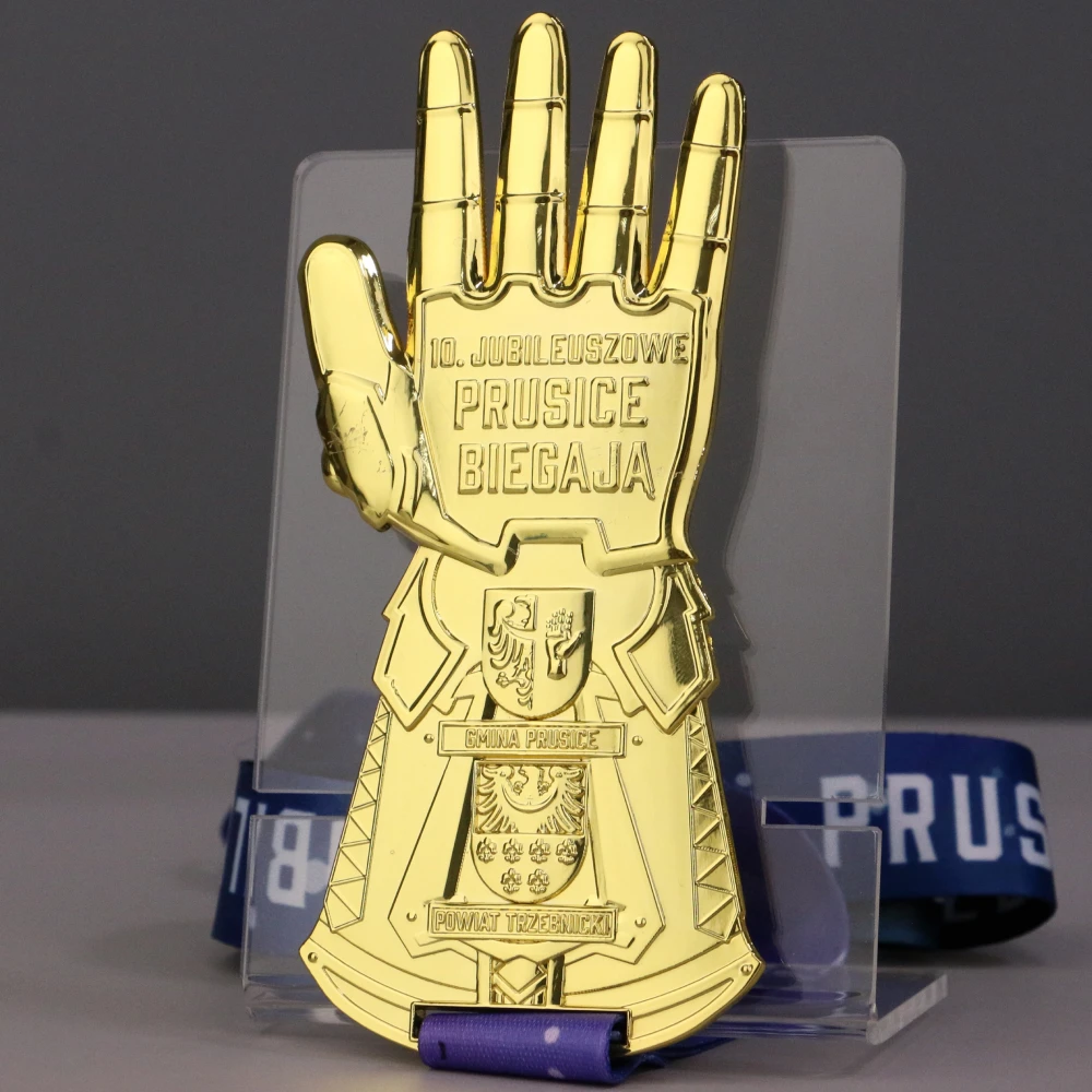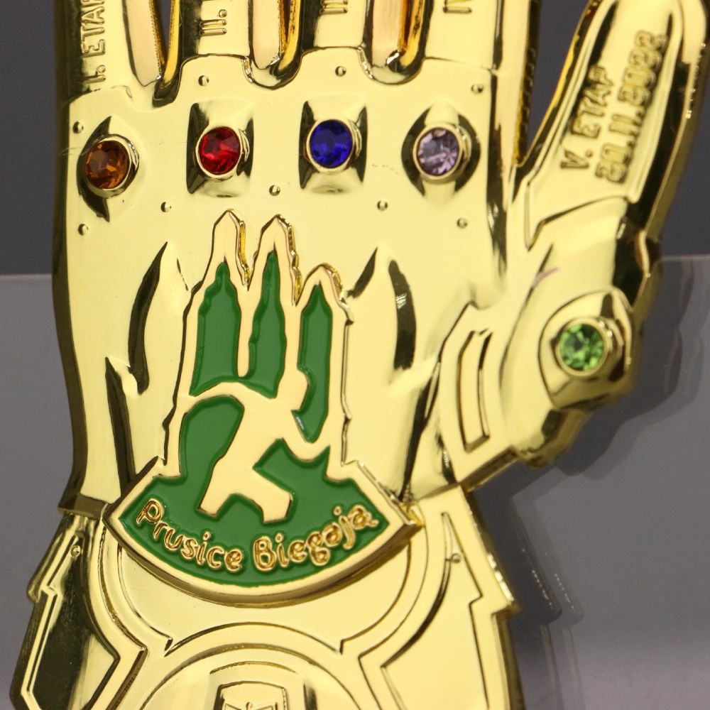 Medal odlewany 3D, galwanizowany, dwustronny, wzorowany na rękawicy Thanosa na jubileuszowe X Prusice Biegają. Każdy palec i kamień na medalu symbolizuje inny etap biegu. Medal zrobił niesamowite wrażenie na uczestnikach, jest to jedna z naszym najbardziej efektowych realizacji.