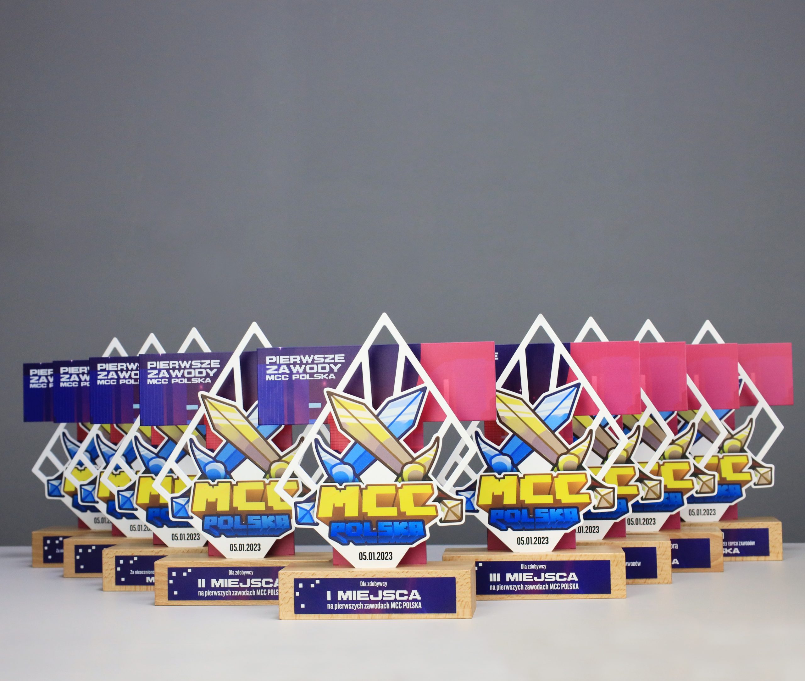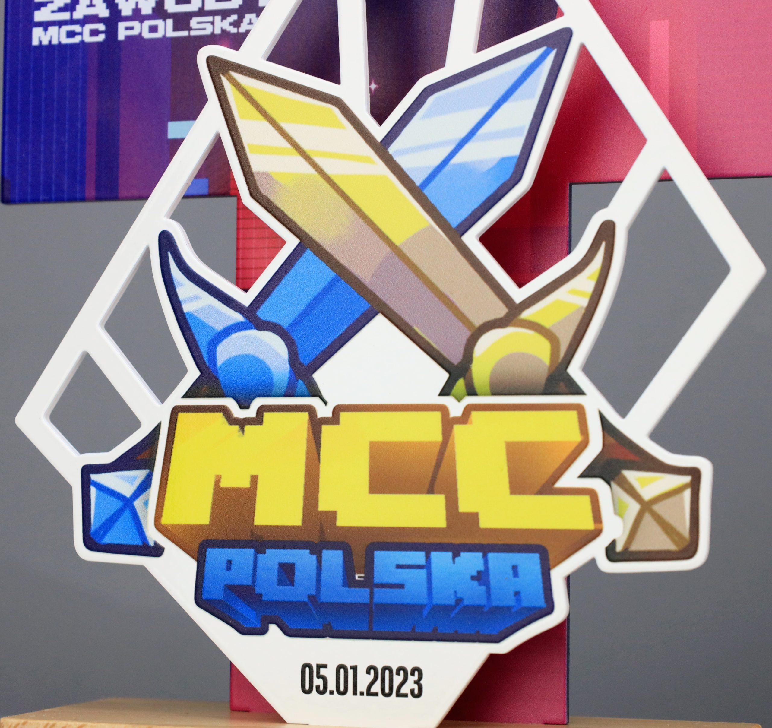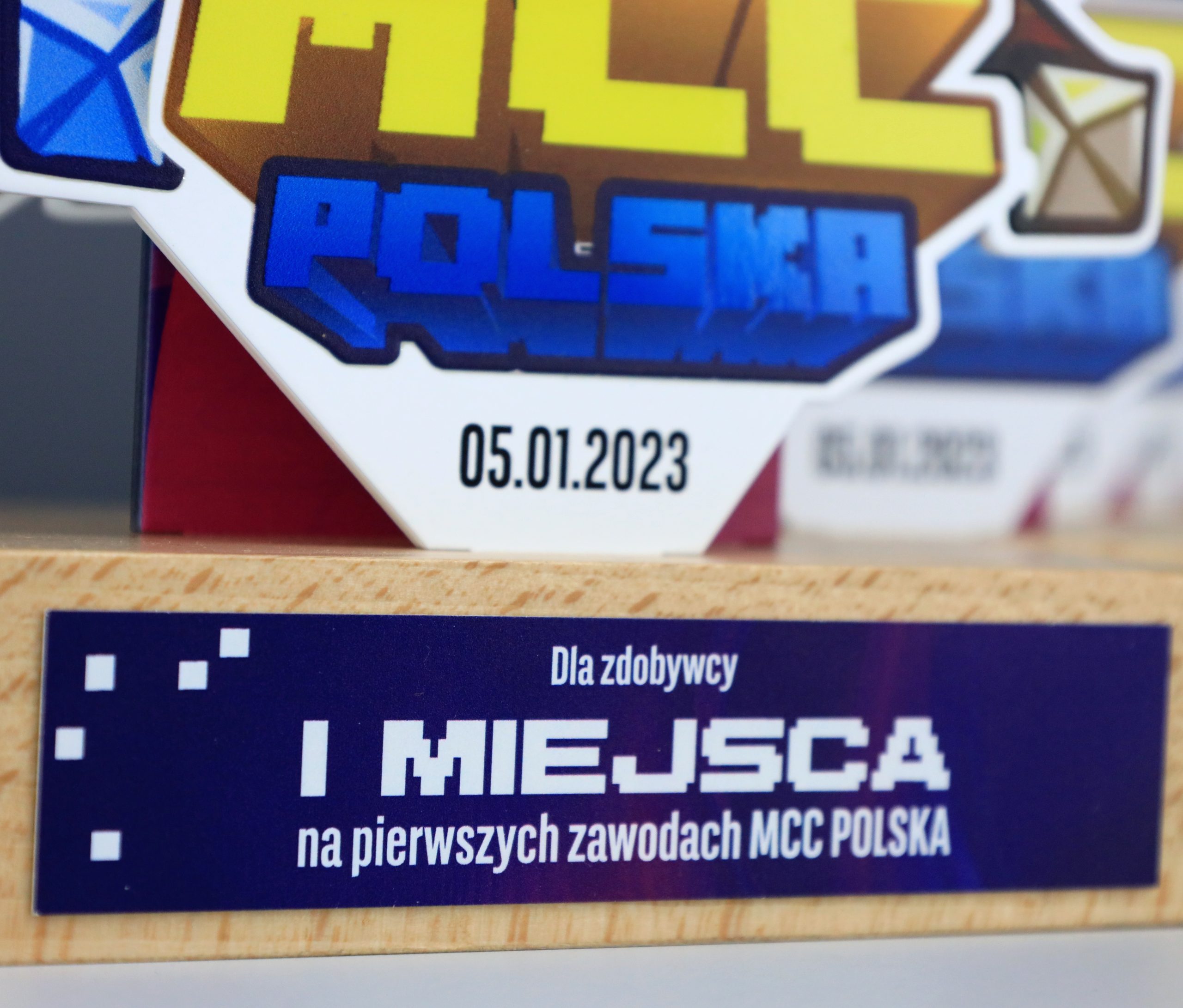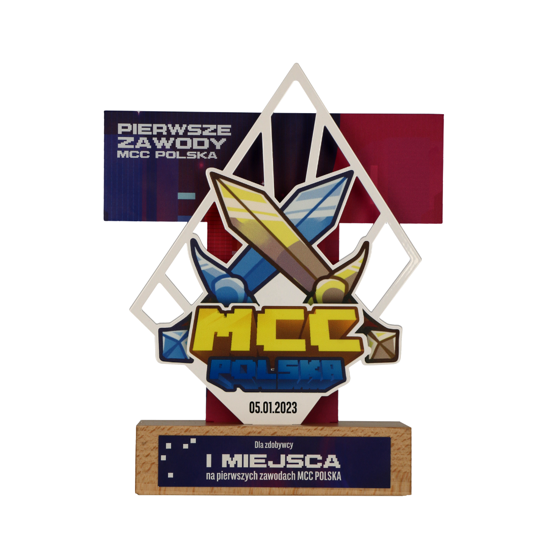 Statuetka metalowa z dwoma panelami, podstawą drewnianą oraz tabliczką znamionową. Wykonana została na turniej MCC Polska w Minecraft. Ekipy przed ekranami zacięcie rywalizowały o nagrody, czyli między innymi nasze statuetki.